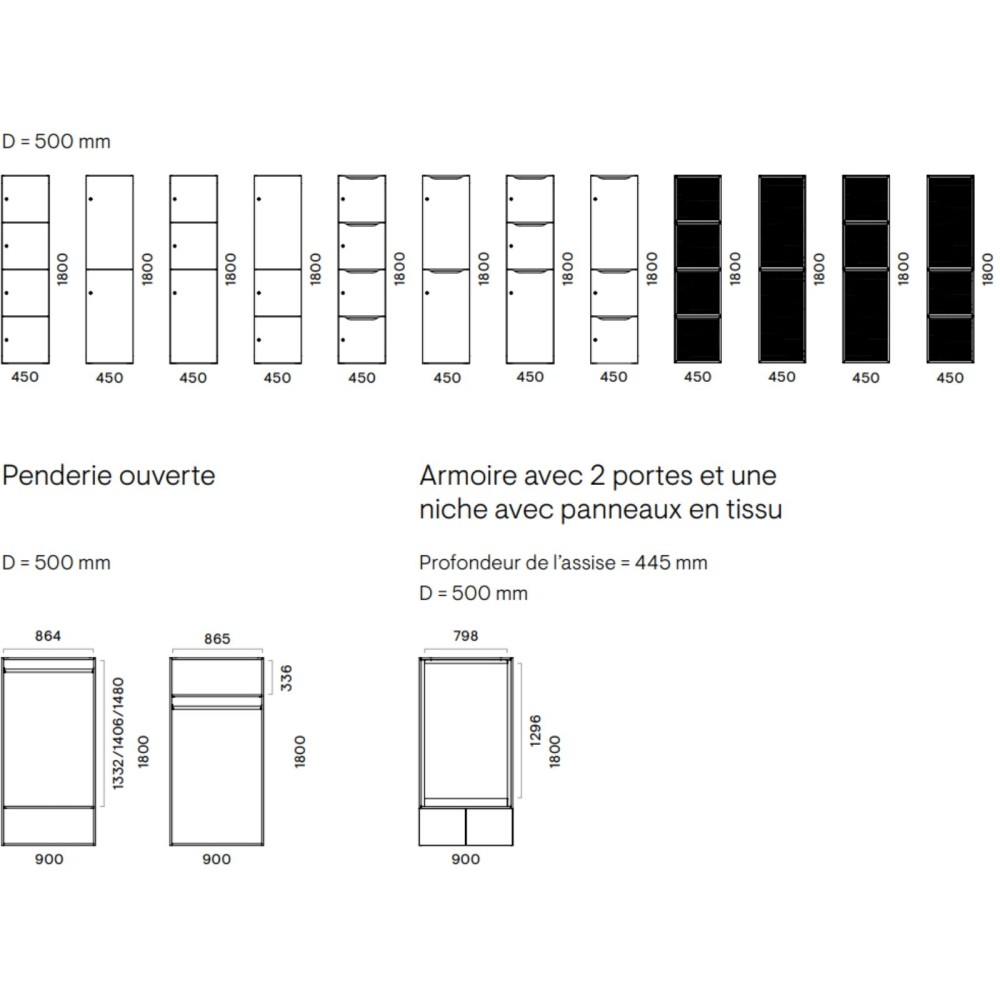 Note : la penderie ouverte et la niche avec tiroirs sont disponibles uniquement sur les configurations à partir de 1800 mm et 2 colonnes.