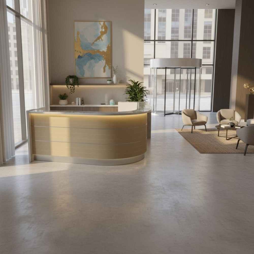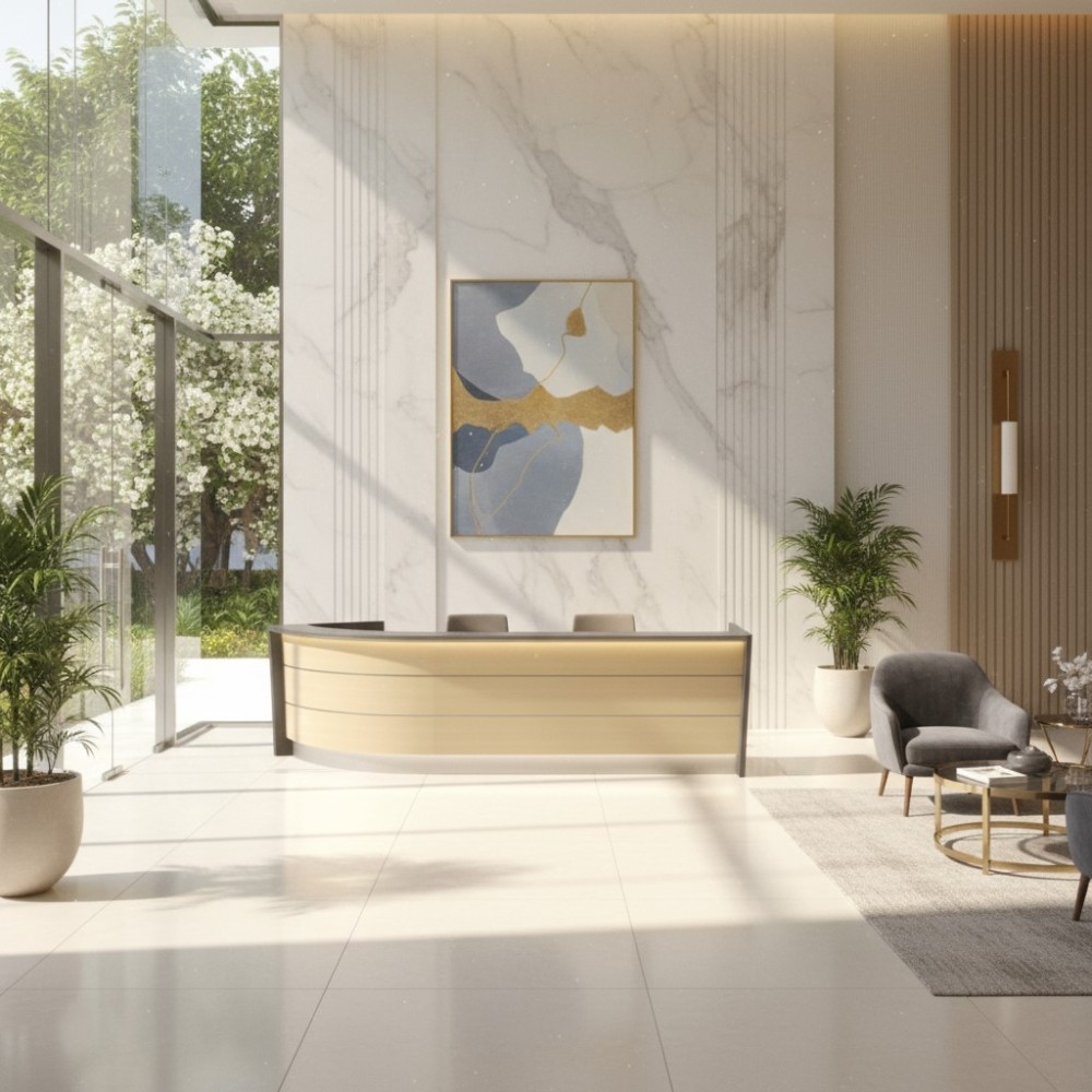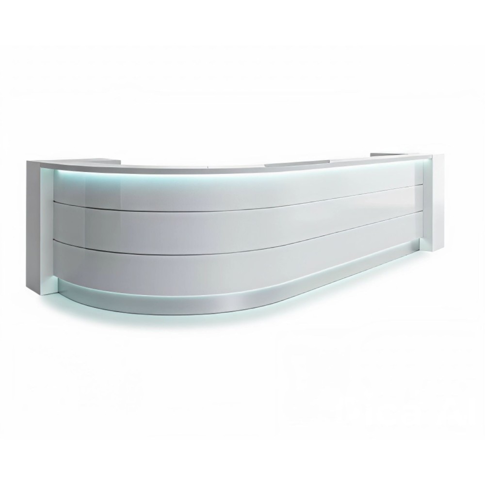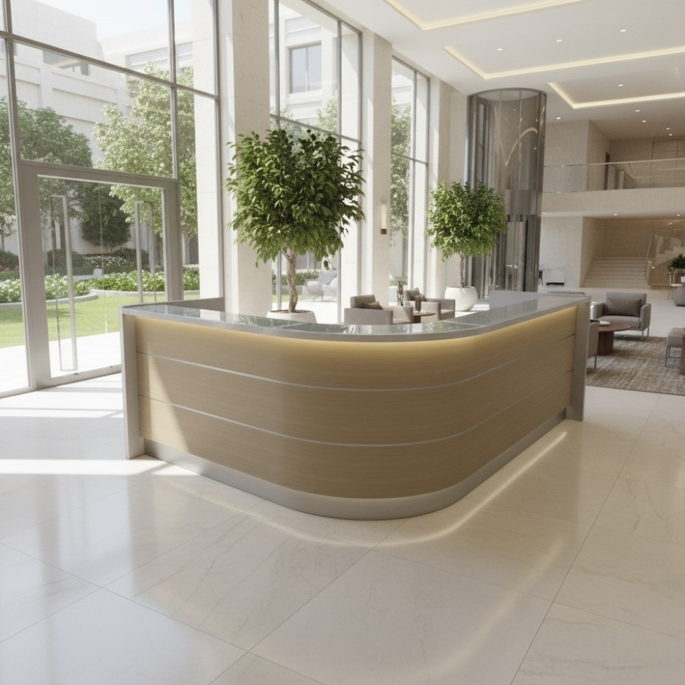 La banque d’accueil Valde dans sa version arrondie incarne le mariage parfait entre élégance et modernité. Son design courbé adoucit les lignes de ton espace d’accueil tout en apportant une touche dynamique et accueillante. Le mélange du verre, de l’aluminium et du stratifié brillant crée une ambiance raffinée, idéale pour les entreprises, hôtels, administrations et cabinets médicaux.