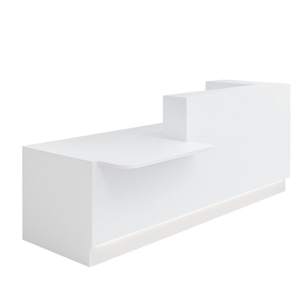 La tablette intégrée offre un espace fonctionnel pour accueillir, renseigner ou travailler confortablement, tandis que l’éclairage LED crée une atmosphère lumineuse et moderne.