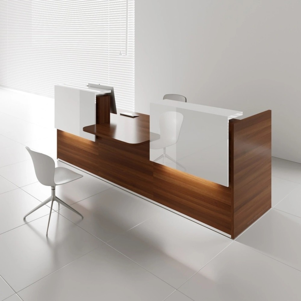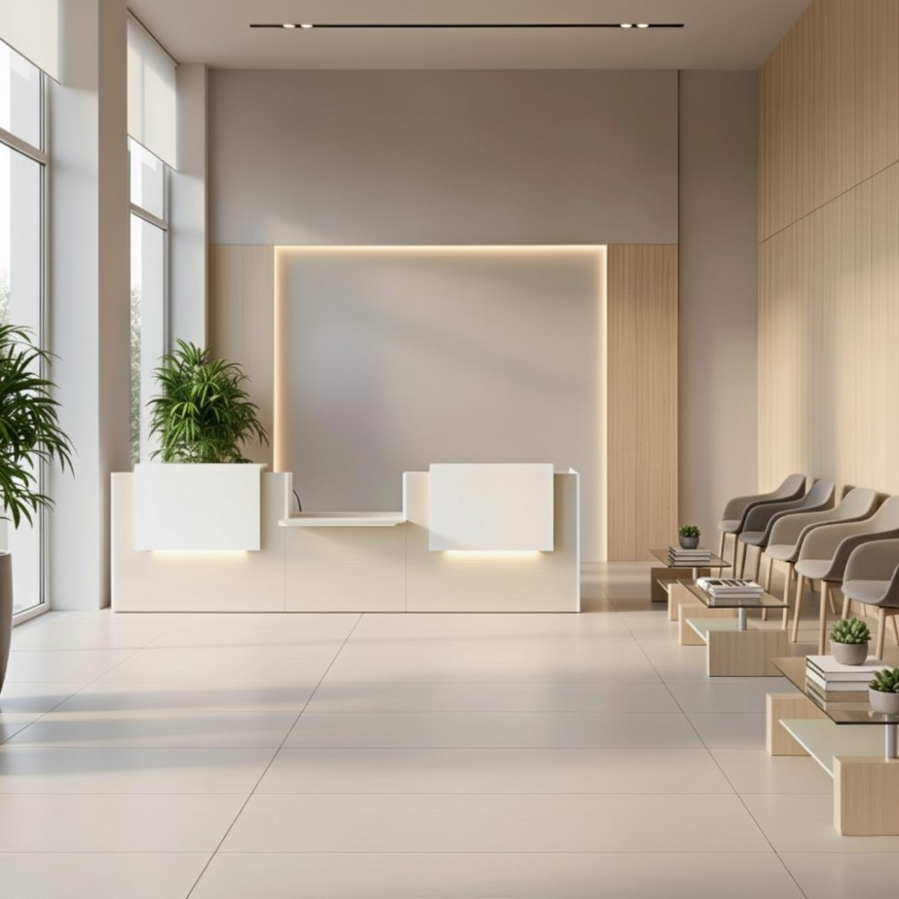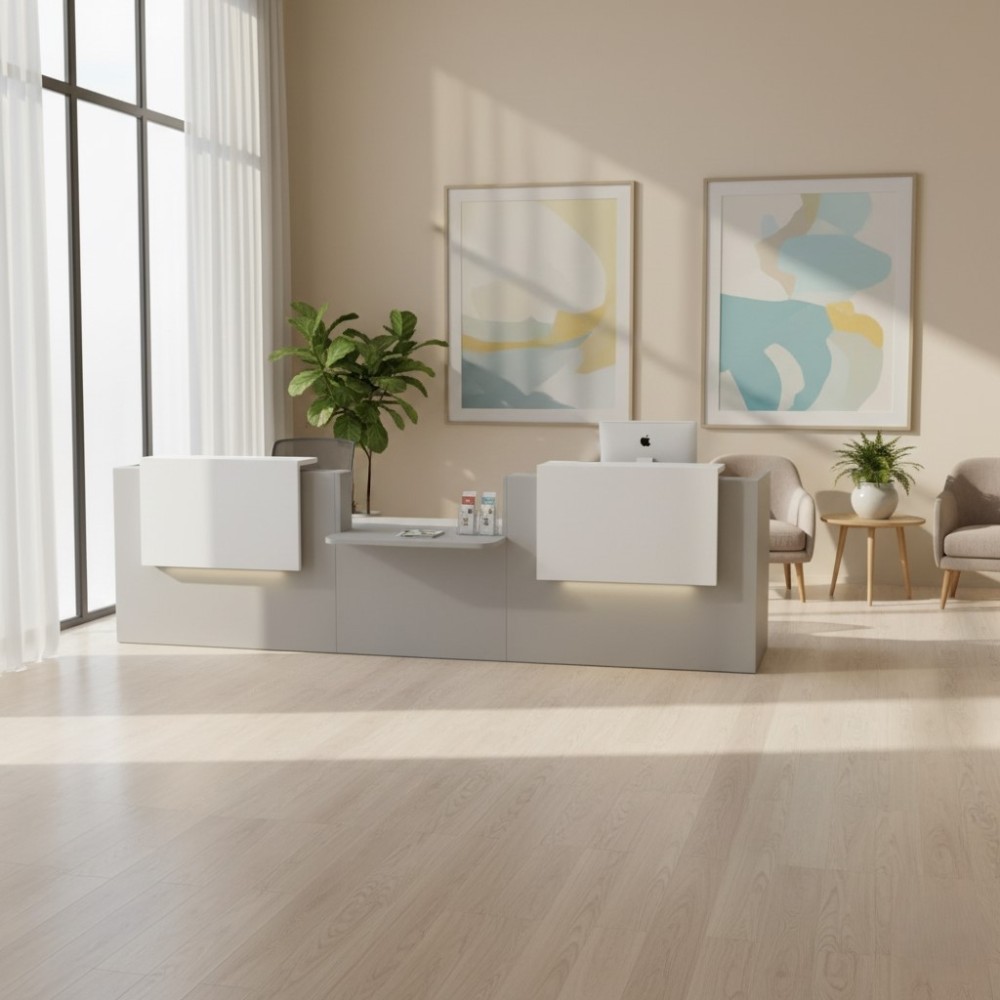 Conçu en mélaminé de haute qualité et agrémenté d’éléments HPL brillants et de verre, ce meuble de réception allie modernité et fonctionnalité. L’éclairage LED intégré dans les réhausses attire le regard et valorise ton espace d’accueil. Idéal pour les entreprises, cabinets médicaux, administrations ou hôtels.
