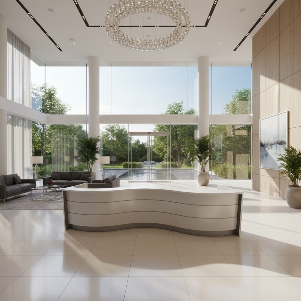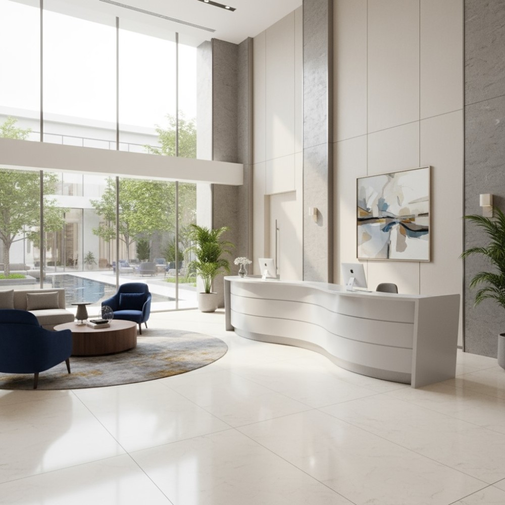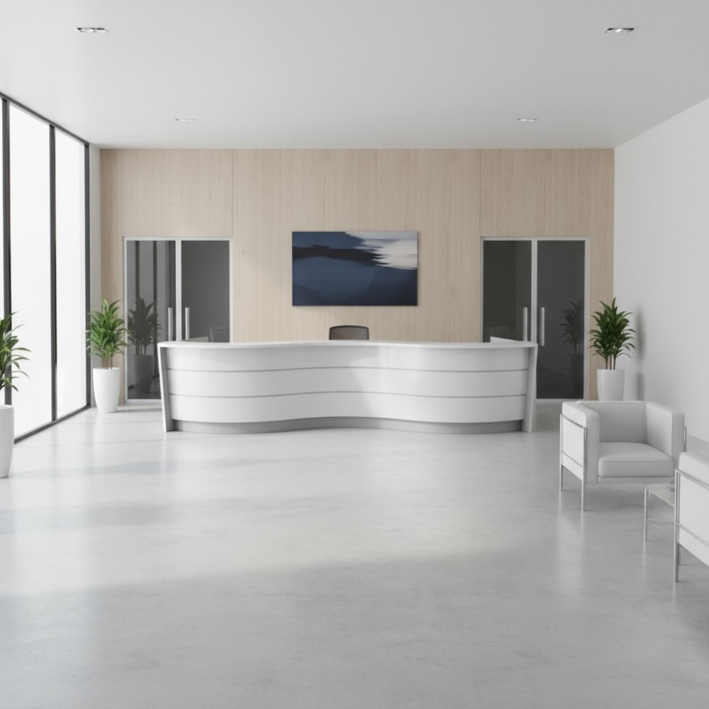 Le meuble de réception Valde adopte une forme de vague unique qui insuffle mouvement et élégance à ton espace d’accueil. Sa silhouette fluide adoucit la géométrie de la pièce et crée un point focal visuellement saisissant. Conçu pour les entreprises, hôtels, administrations et cabinets médicaux, ce comptoir offre un équilibre parfait entre design et praticité.