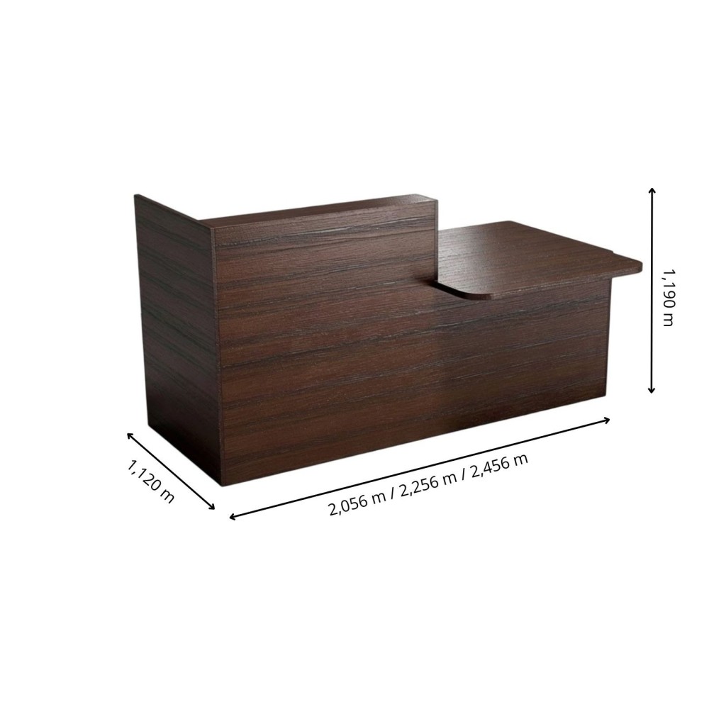 Le meuble de réception Tera est pensé pour offrir un espace d’accueil élégant et inclusif. Sans réhausse ni LED (possible en option), il conserve une ligne sobre et moderne. Un côté plus bas, situé à gauche ou à droite selon la configuration choisie, permet un accueil facilité des personnes à mobilité réduite.