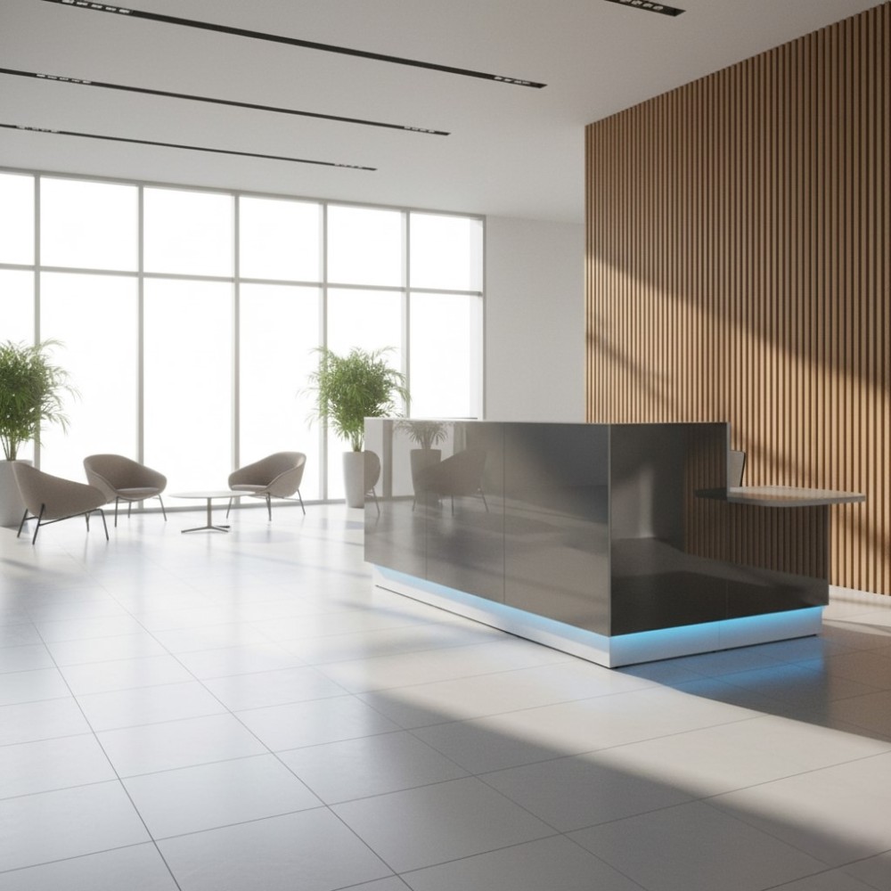 Meuble de réception gris dans espace d'accueil lumineux