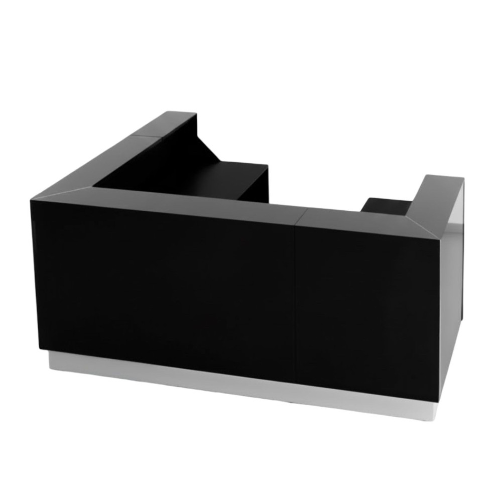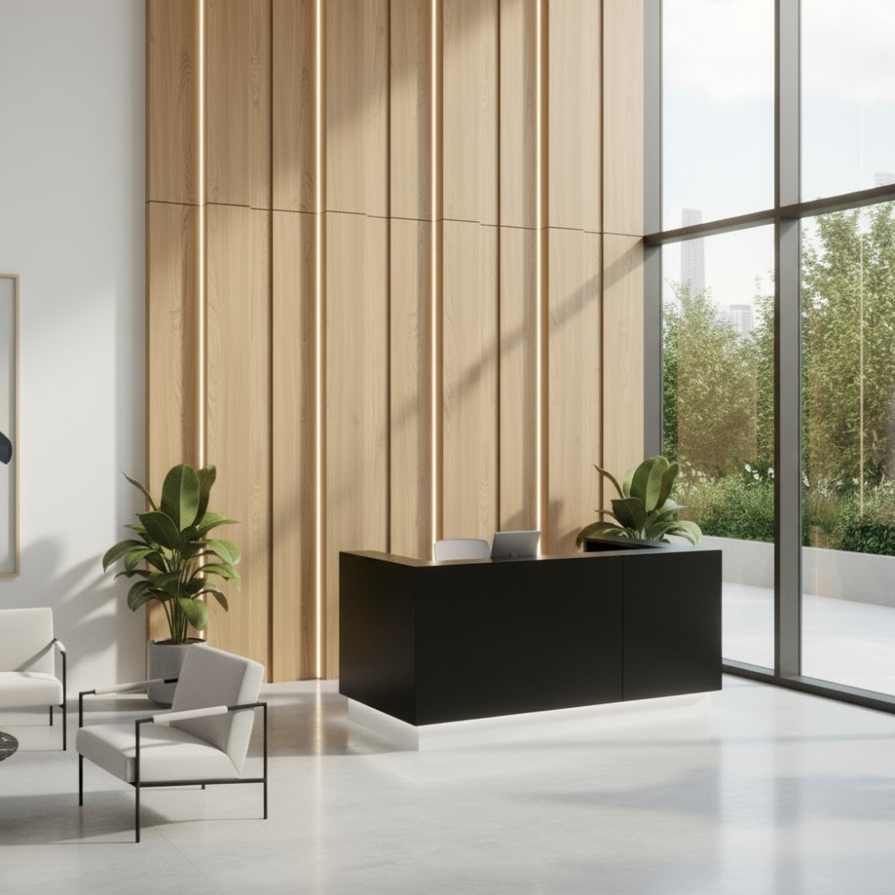 Banque d'accueil noire dans pièce lumineuse avec canapé d'accueil