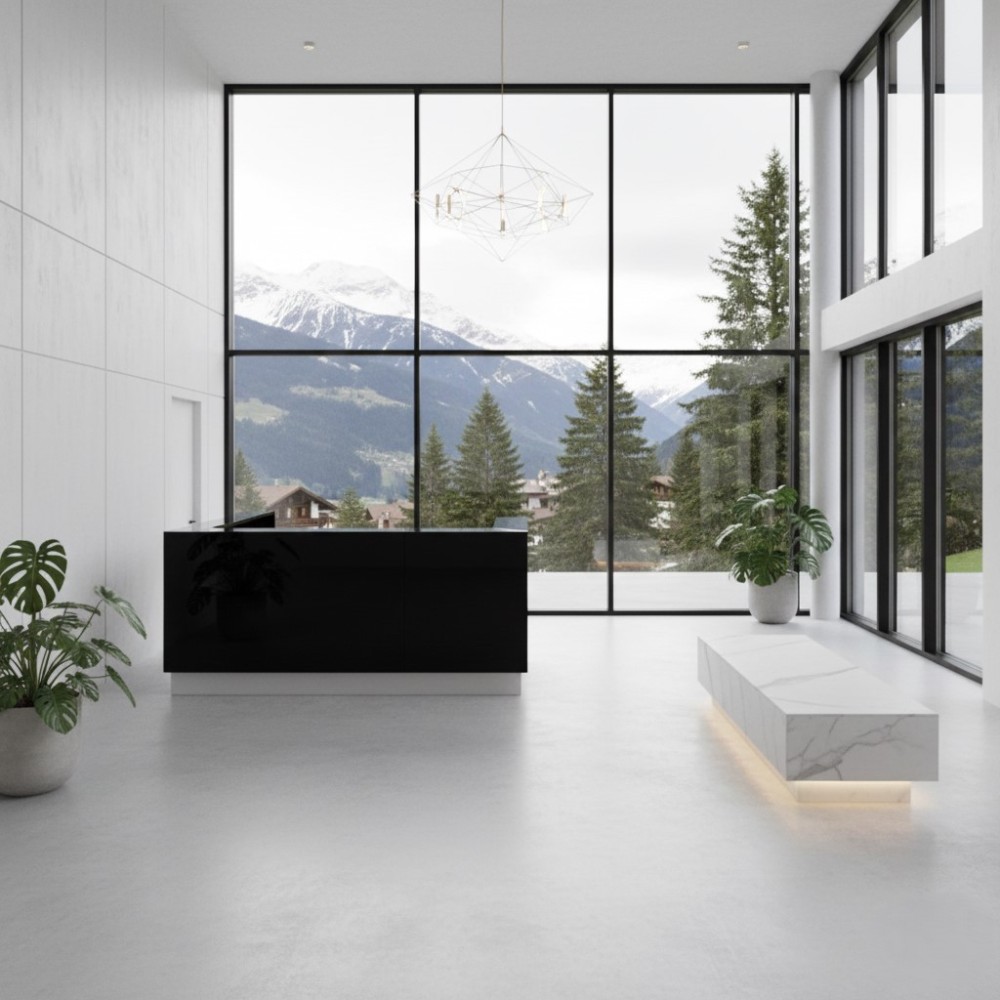Meuble de réception noir dans un hall d'entrée d'hôtel en suisse