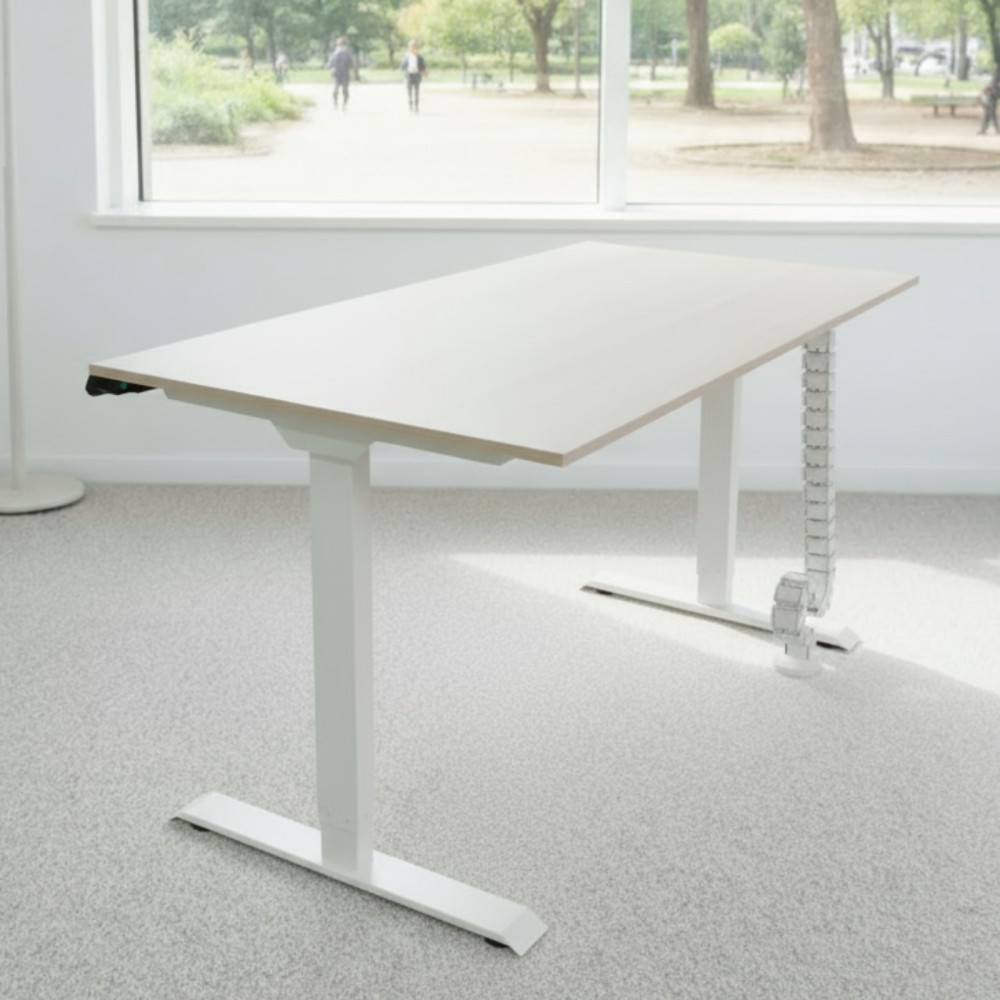 Bureau assis-debout électrique Start-Up avec plateau bois clair et piètement blanc, idéal pour un espace de travail ergonomique