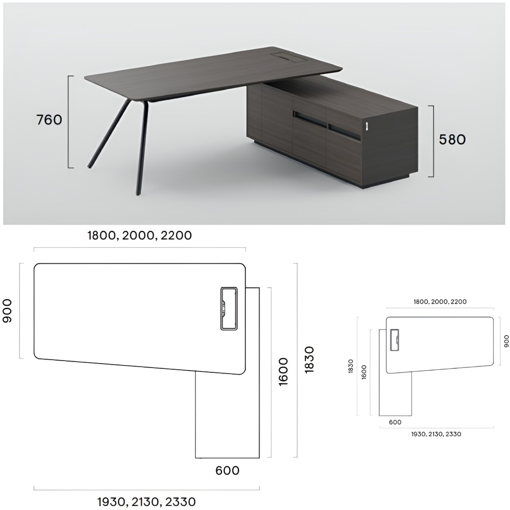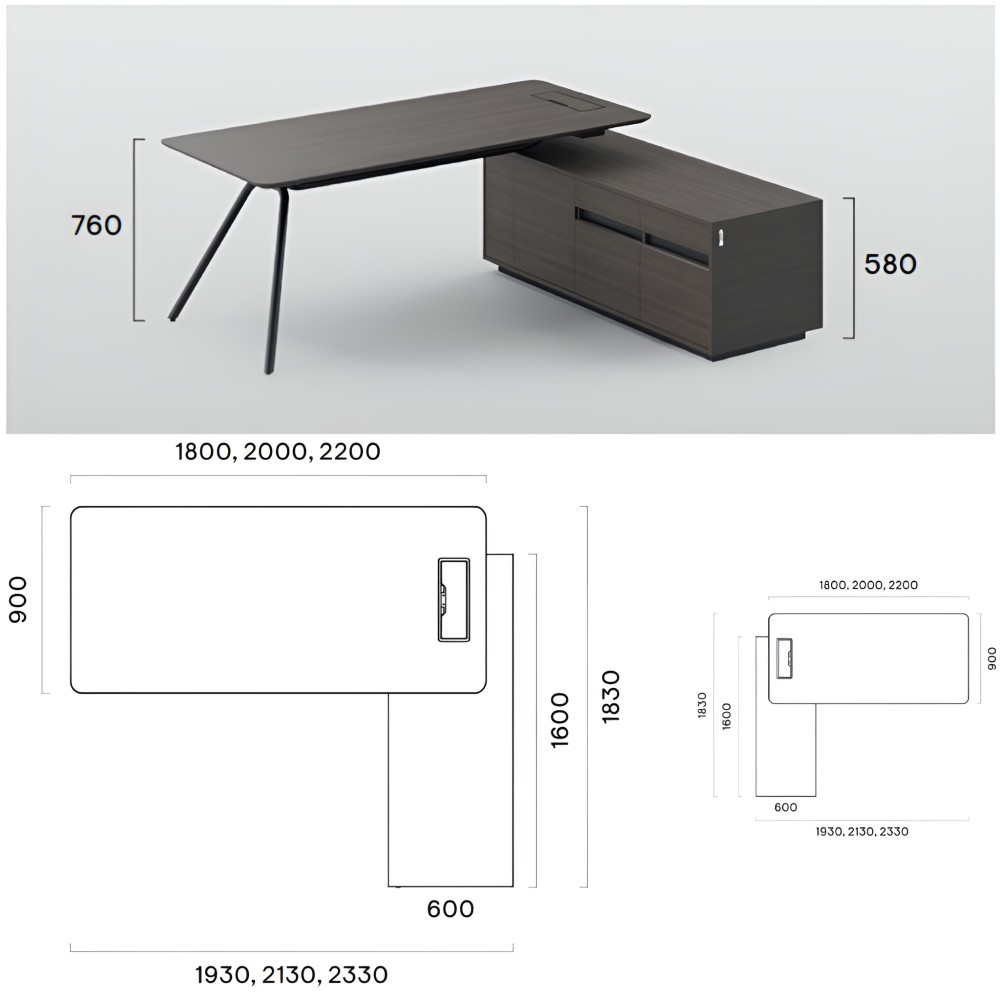 Le bureau de direction ARQUS est disponible en plusieurs dimensions pour s’adapter à tous les espaces professionnels, avec ou sans caisson fixe optionnel.