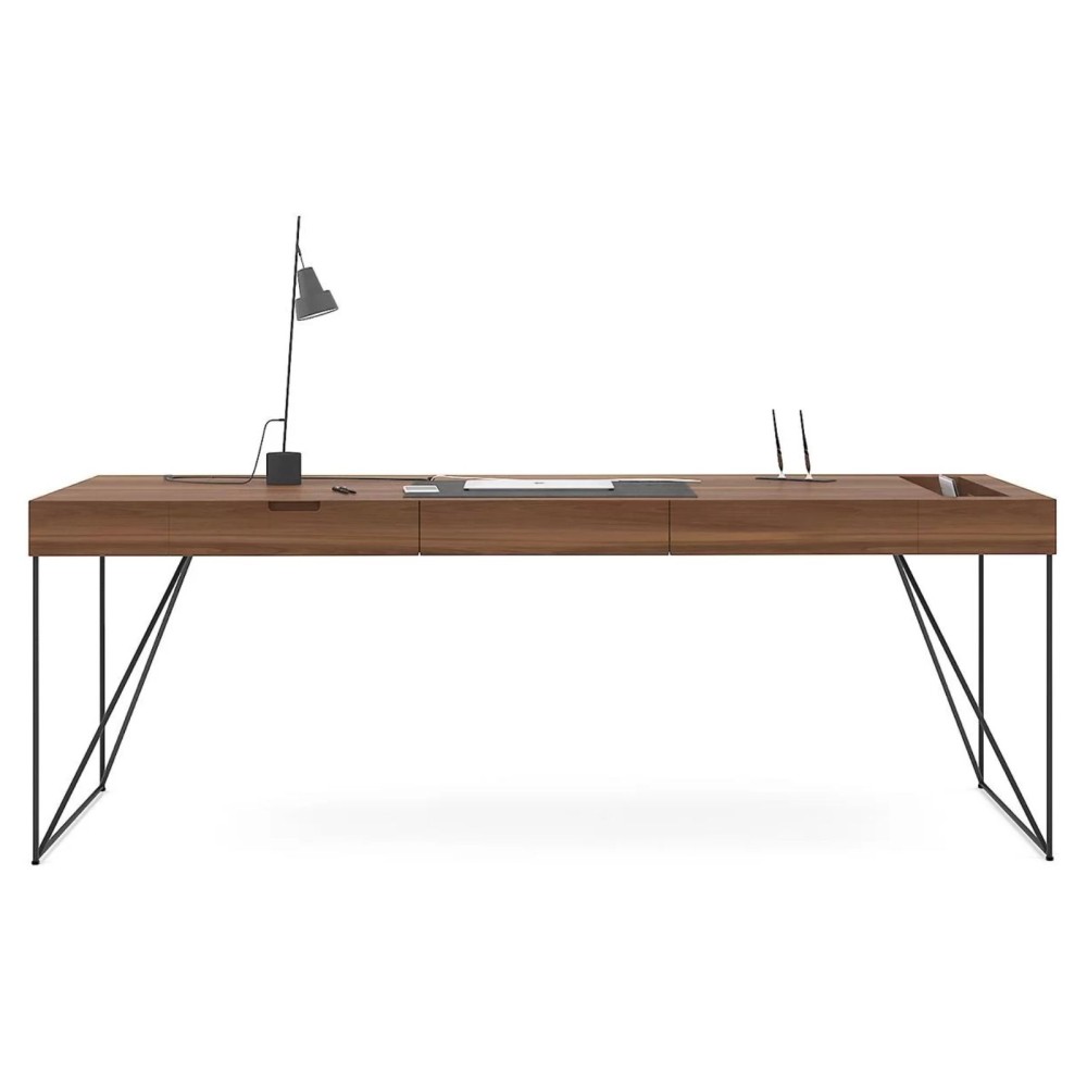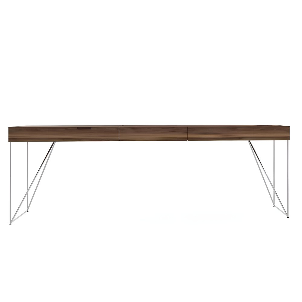 Son plateau épais et ses pieds en acier forment une silhouette minimaliste, stable et sophistiquée. Le bois naturel apporte une chaleur visuelle tandis que la structure métallique assure une excellente solidité, idéale pour un bureau de direction moderne et clair.