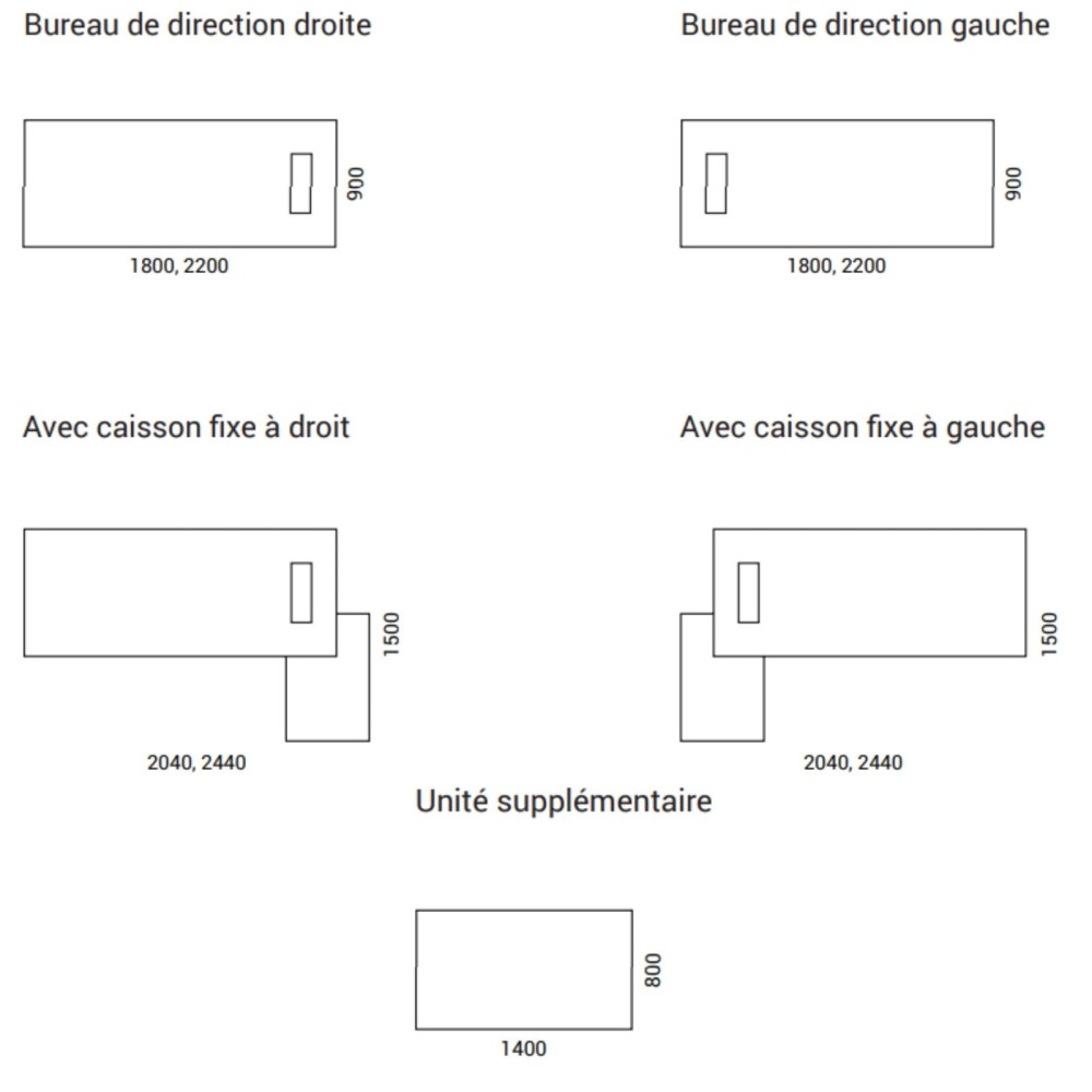 - Caisson fixe latéral (à gauche ou à droite) intégré au bureau