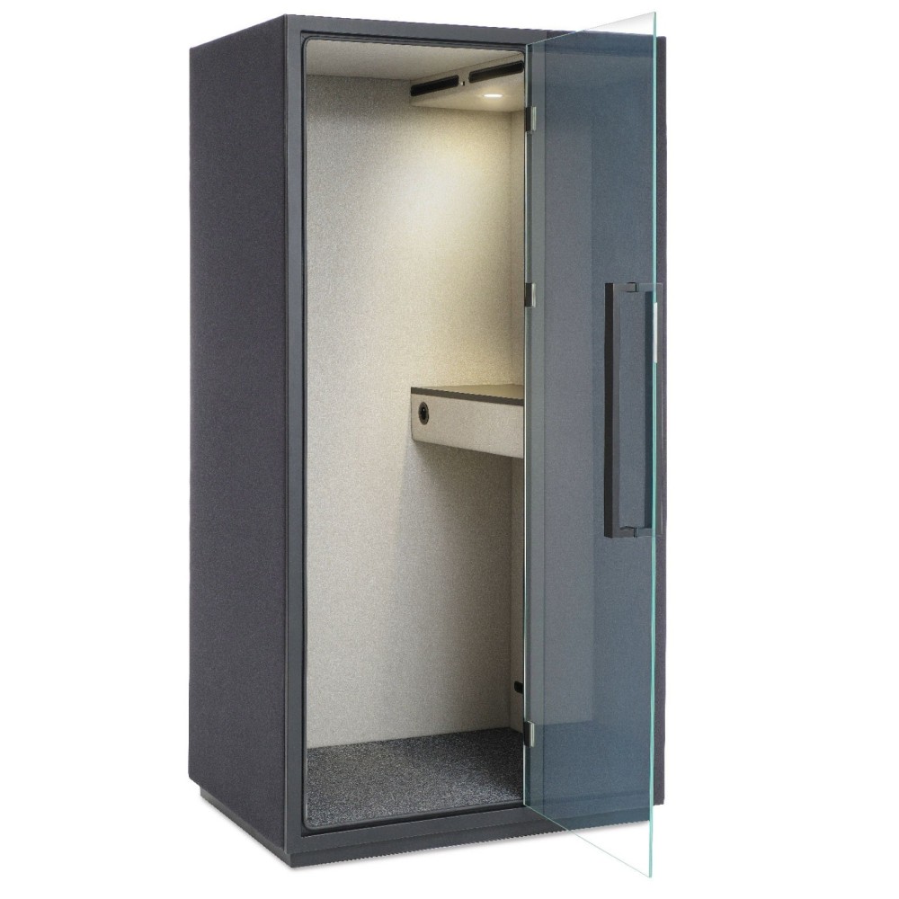Conçue pour les environnements professionnels ouverts, la cabine Quadra isole efficacement les bruits ambiants et protège la confidentialité des conversations. Elle est équipée de portes en verre feuilleté et trempé acoustique (Rw = 38 dB), conformes aux normes EN ISO 10140 et ISO 717-1. Ces vitrages renforcés garantissent une excellente insonorisation tout en offrant sécurité et élégance.