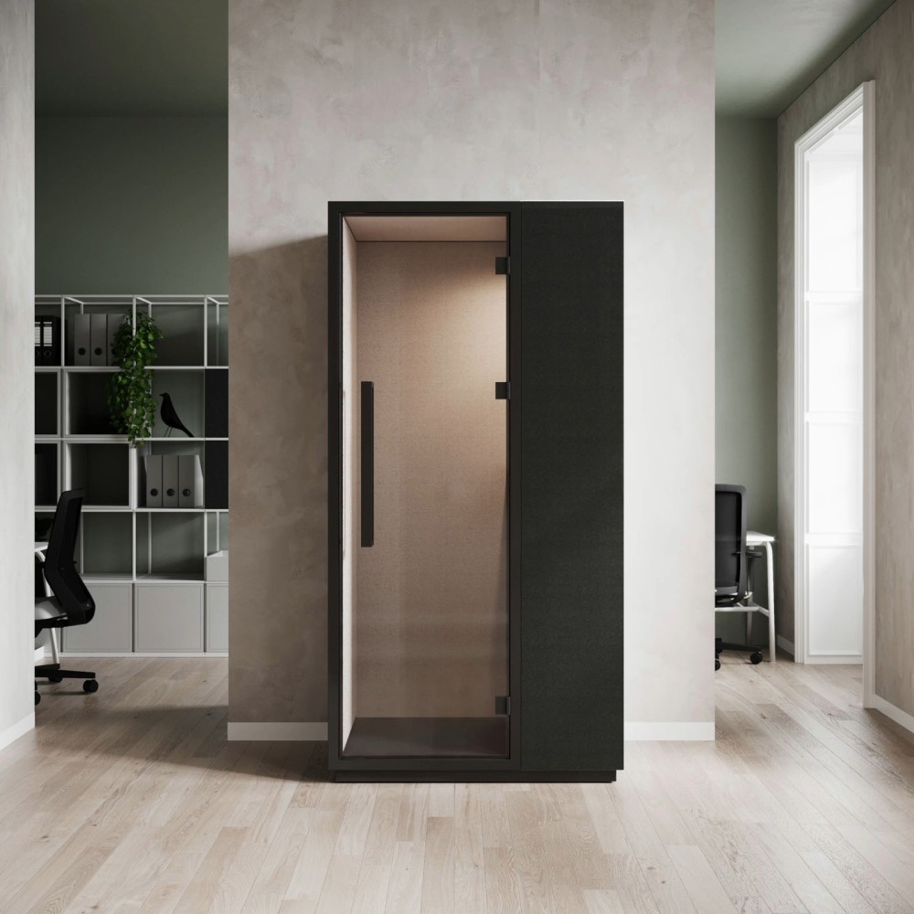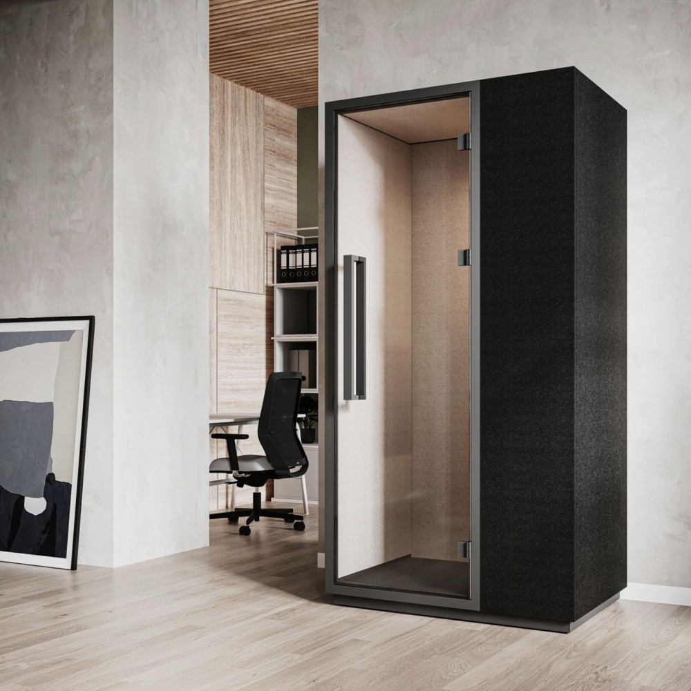 La Quadra Silent Box se distingue par son design minimaliste et ses finitions textiles acoustiques haut de gamme. Son cadre noir et ses parois intérieures tapissées s’intègrent naturellement dans tout type d’espace professionnel — du bureau d’entreprise au coworking. Son allure épurée et ses matériaux durables en font une solution aussi élégante que fonctionnelle.