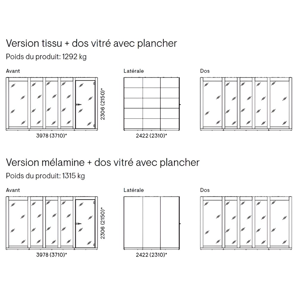 - Dimensions extérieures : env. 3978 x 2409 x 2225 mm