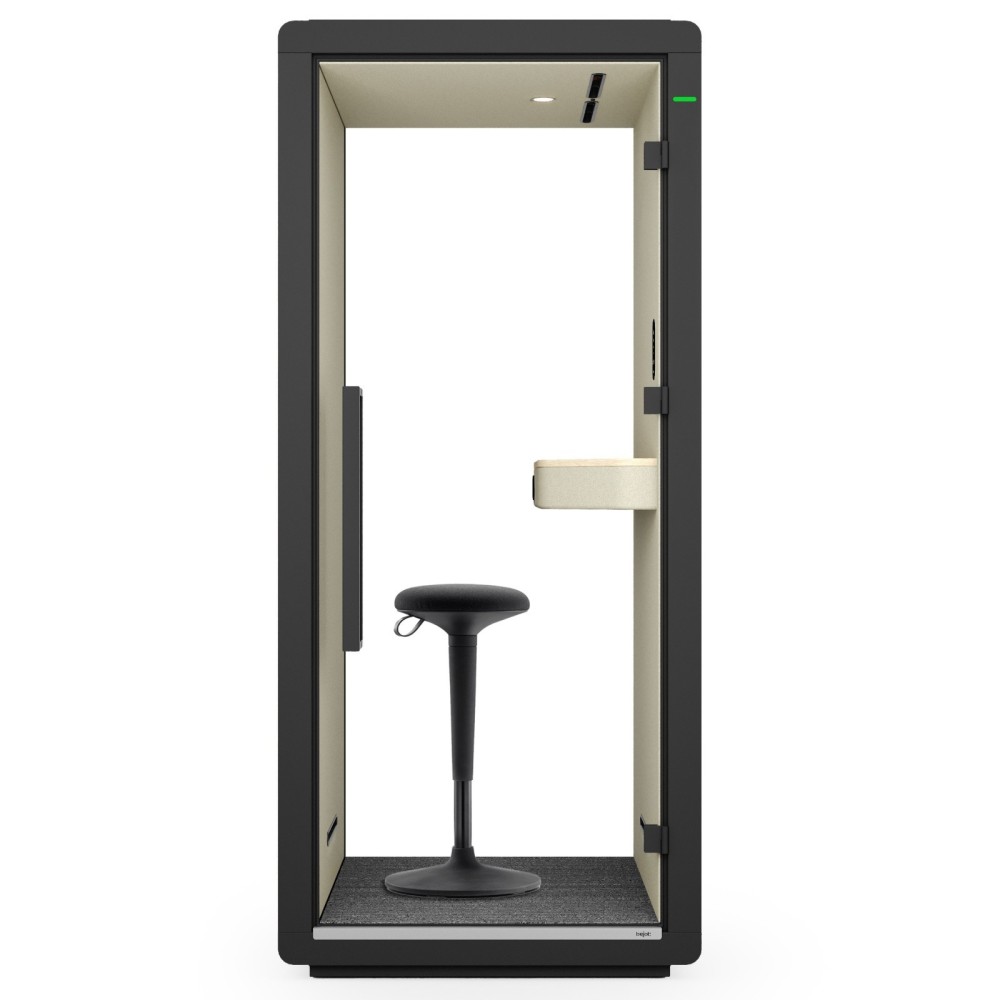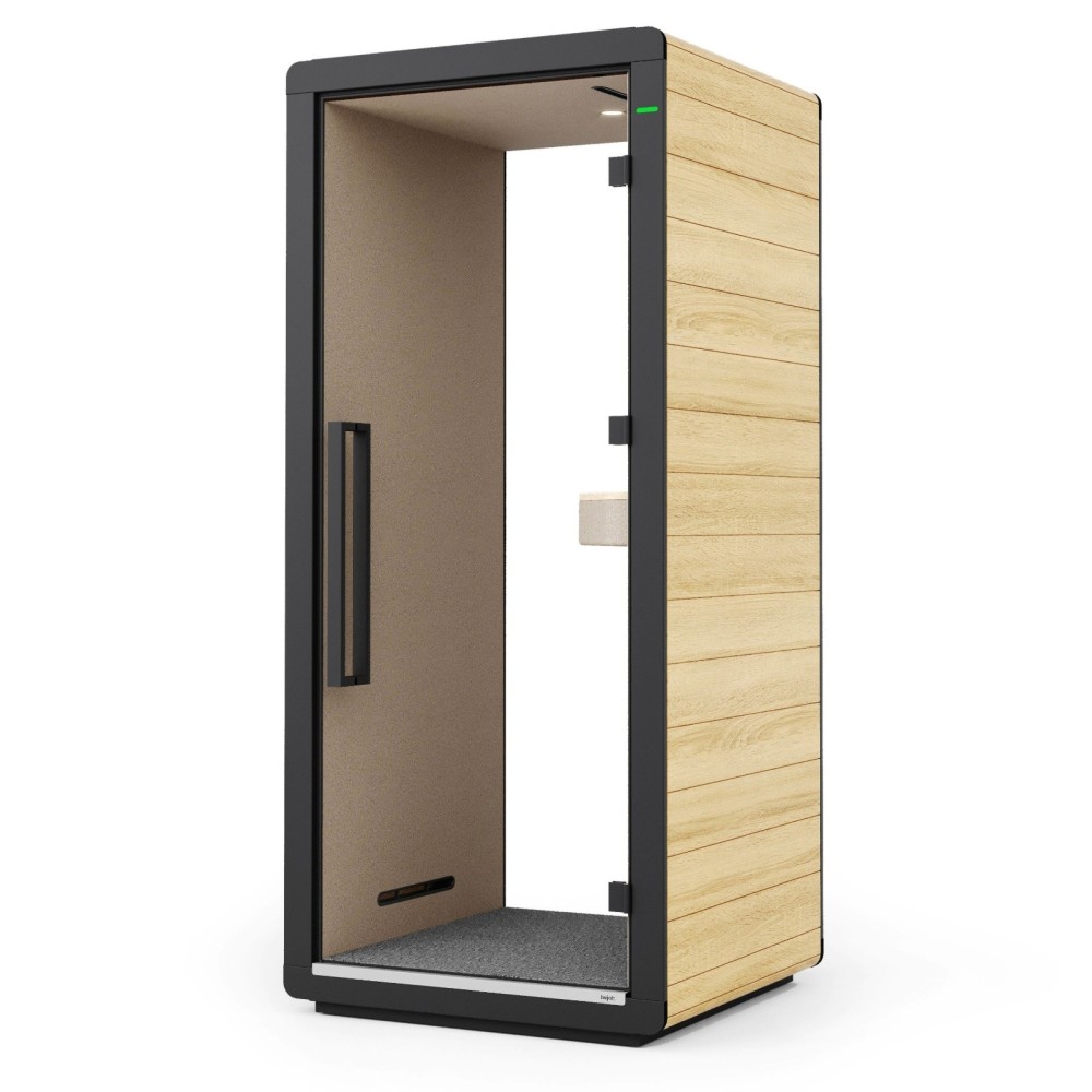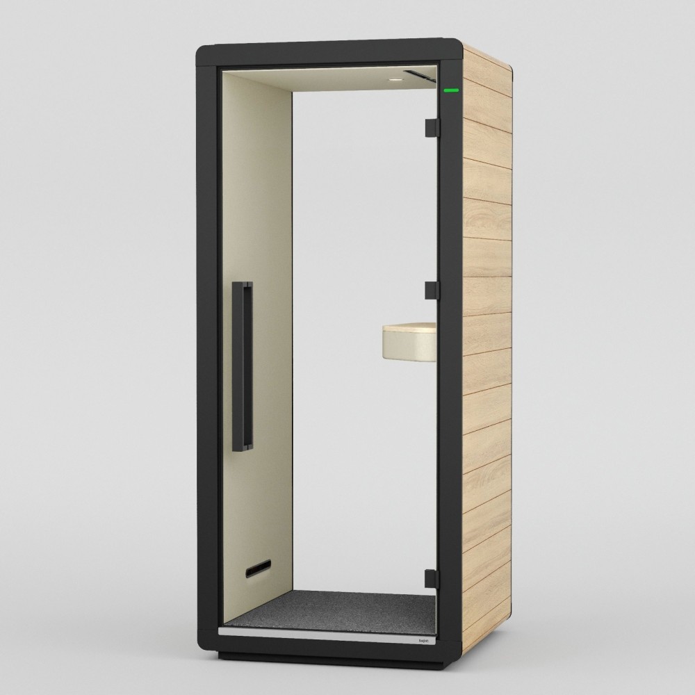 Cette version en finition bois clair se distingue par son esthétique chaleureuse et biophilique. Elle s’intègre parfaitement dans les espaces modernes ou naturels, apportant une touche d’élégance et de sérénité. À l’intérieur, un tabouret réglable en hauteur et un plan de travail intégré permettent une posture confortable pour le travail sur ordinateur ou les appels vidéo.