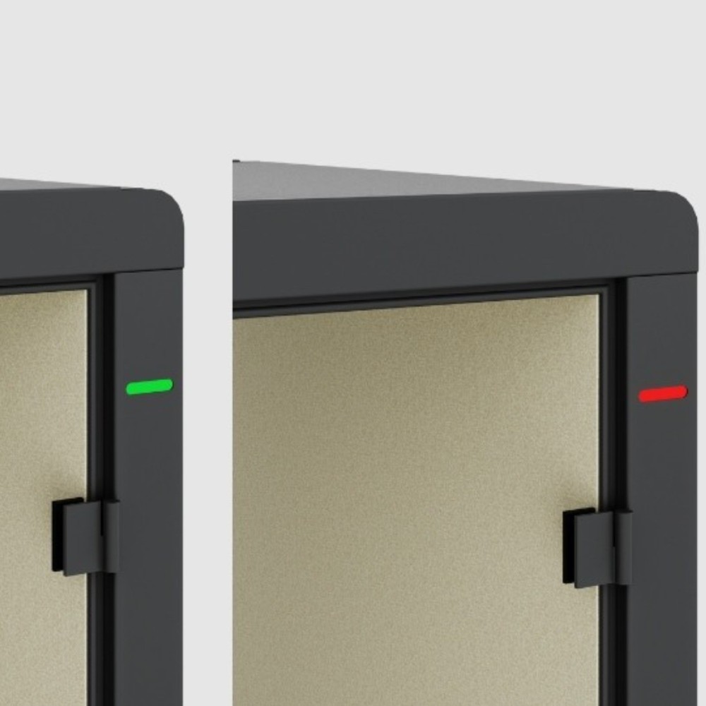 Un panneau de commande tactile permet de contrôler la lumière et la ventilation. L’indicateur lumineux extérieur (vert/rouge) affiche en temps réel la disponibilité de la cabine. Les utilisateurs bénéficient d’un port USB et d’une prise électrique intégrés pour recharger leurs appareils en toute simplicité.