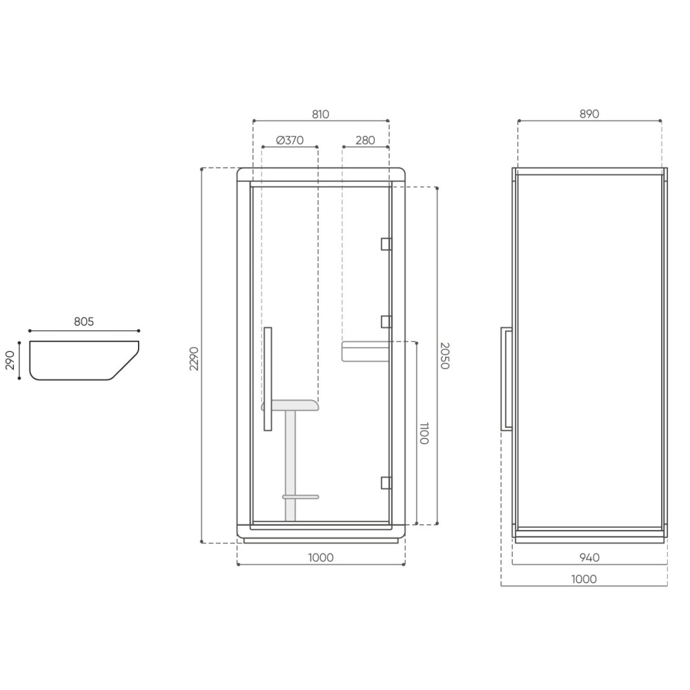 Chaque cabine est équipée d’un tabouret réglable en hauteur (540–800 mm) et d’un plan de travail intégré à 1100 mm de haut, idéal pour le travail debout ou assis dynamique. L’éclairage LED et la ventilation silencieuse s’activent automatiquement grâce à un capteur de mouvement, offrant une expérience d’utilisation fluide et hygiénique.