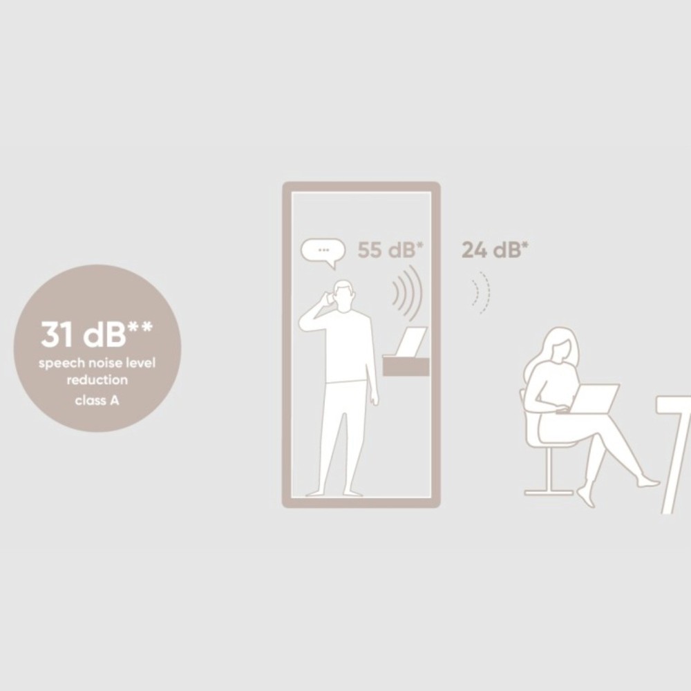 Grâce à une conception basée sur les standards les plus exigeants, la cabine réduit efficacement les sons de la parole (classe A selon la norme ISO 3382-3:2012). Les tests acoustiques démontrent une réduction de 55 dB à 21–24 dB, garantissant une confidentialité optimale. Les conversations menées à l’intérieur ne perturbent pas le travail des autres collaborateurs, tout en préservant le confort sonore ambiant.