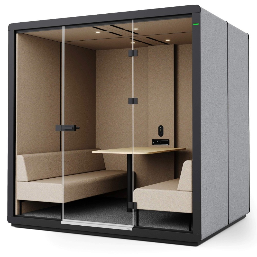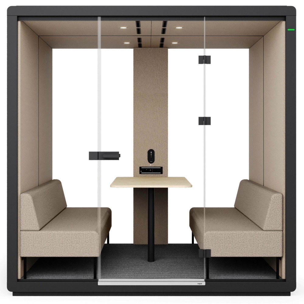 La cabine est équipée de deux larges banquettes tapissées se faisant face et d’une table centrale spacieuse, offrant un confort optimal pour quatre utilisateurs. Cet aménagement favorise les échanges collaboratifs, les entretiens et les réunions en petit comité. L’éclairage LED intégré et la ventilation silencieuse se déclenchent automatiquement grâce à un capteur de mouvement, assurant un confort immédiat à chaque utilisation.
