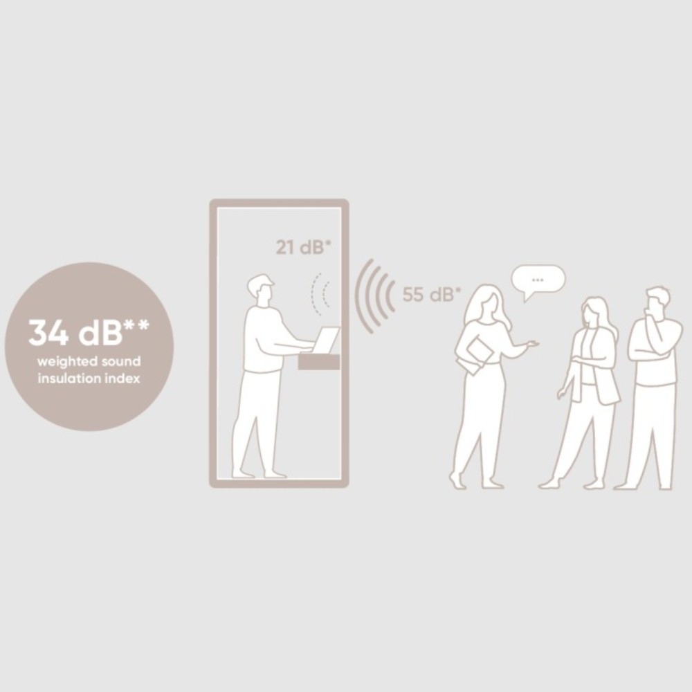 Grâce à une conception soignée et à l’utilisation de matériaux hautement performants, la cabine atteint une isolation acoustique pondérée de 34 dB (Rw) et une réduction du bruit de parole de 31 dB, conforme à la classe A selon la norme ISO 3382-3:2012. Les conversations internes restent parfaitement confidentielles, tandis que les nuisances extérieures sont efficacement atténuées pour garantir une concentration totale.