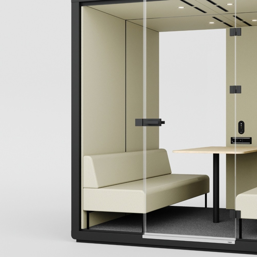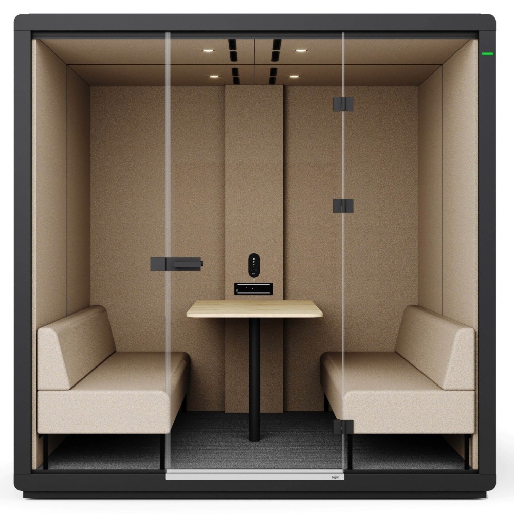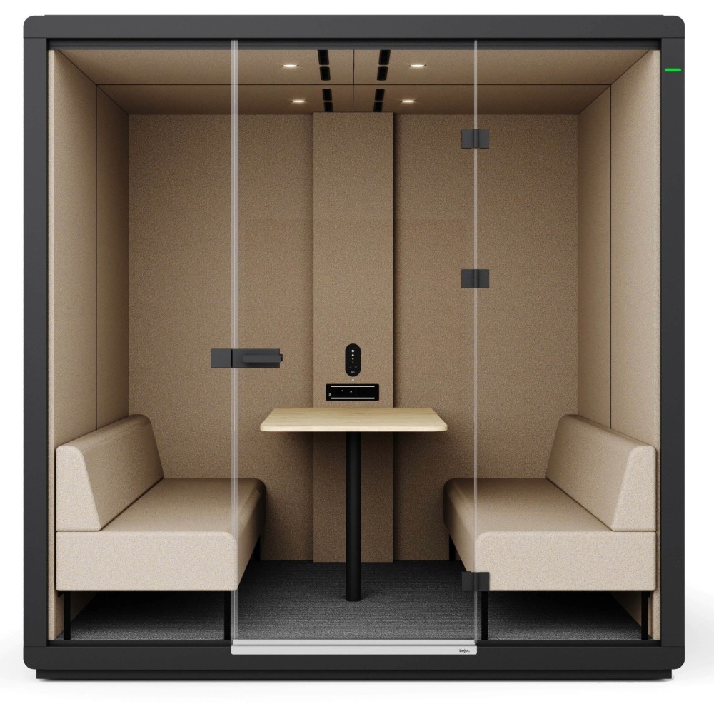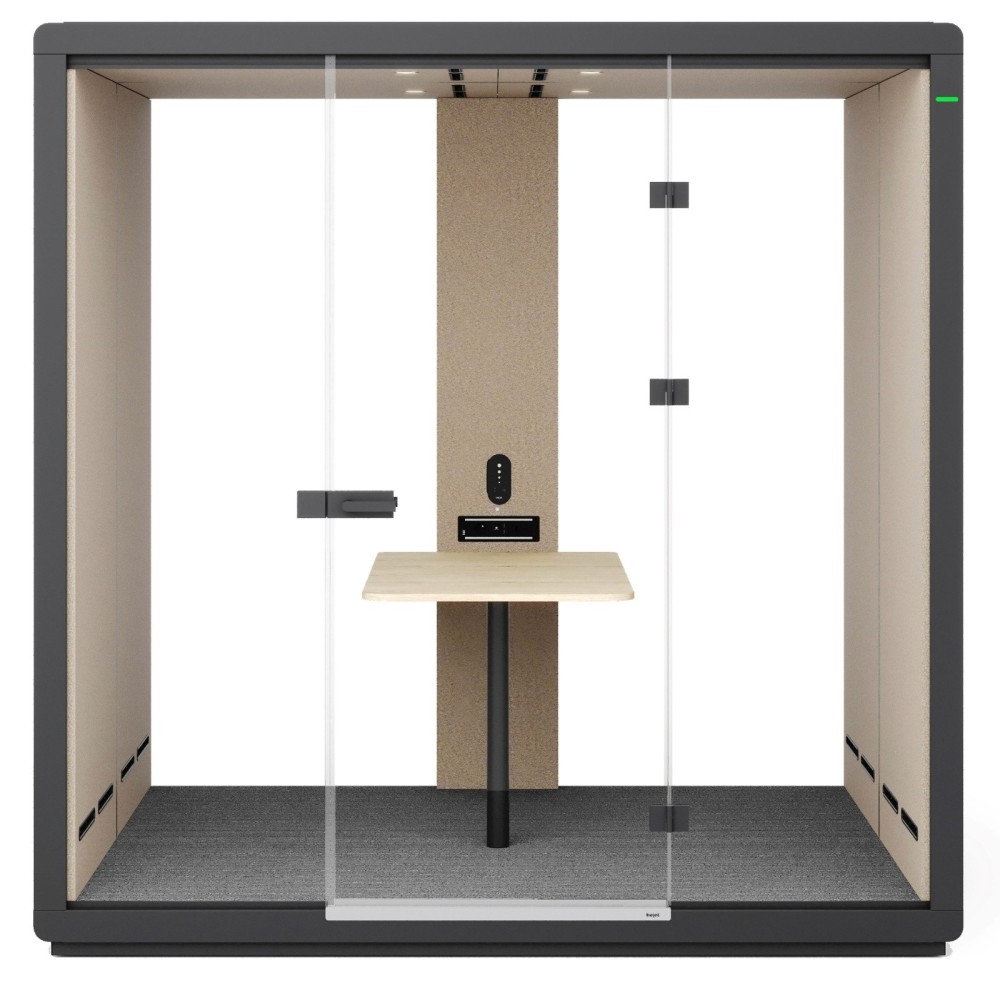 La cabine FH 4T G2 Wood est équipée de deux banquettes tapissées en vis-à-vis et d’une table centrale en bois clair, créant un espace propice à la collaboration et aux échanges professionnels. L’éclairage LED intégré et la ventilation silencieuse à capteur de présence assurent un confort immédiat et durable. Le système renouvelle automatiquement l’air après chaque utilisation, garantissant un environnement sain.