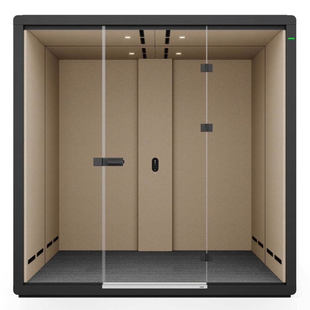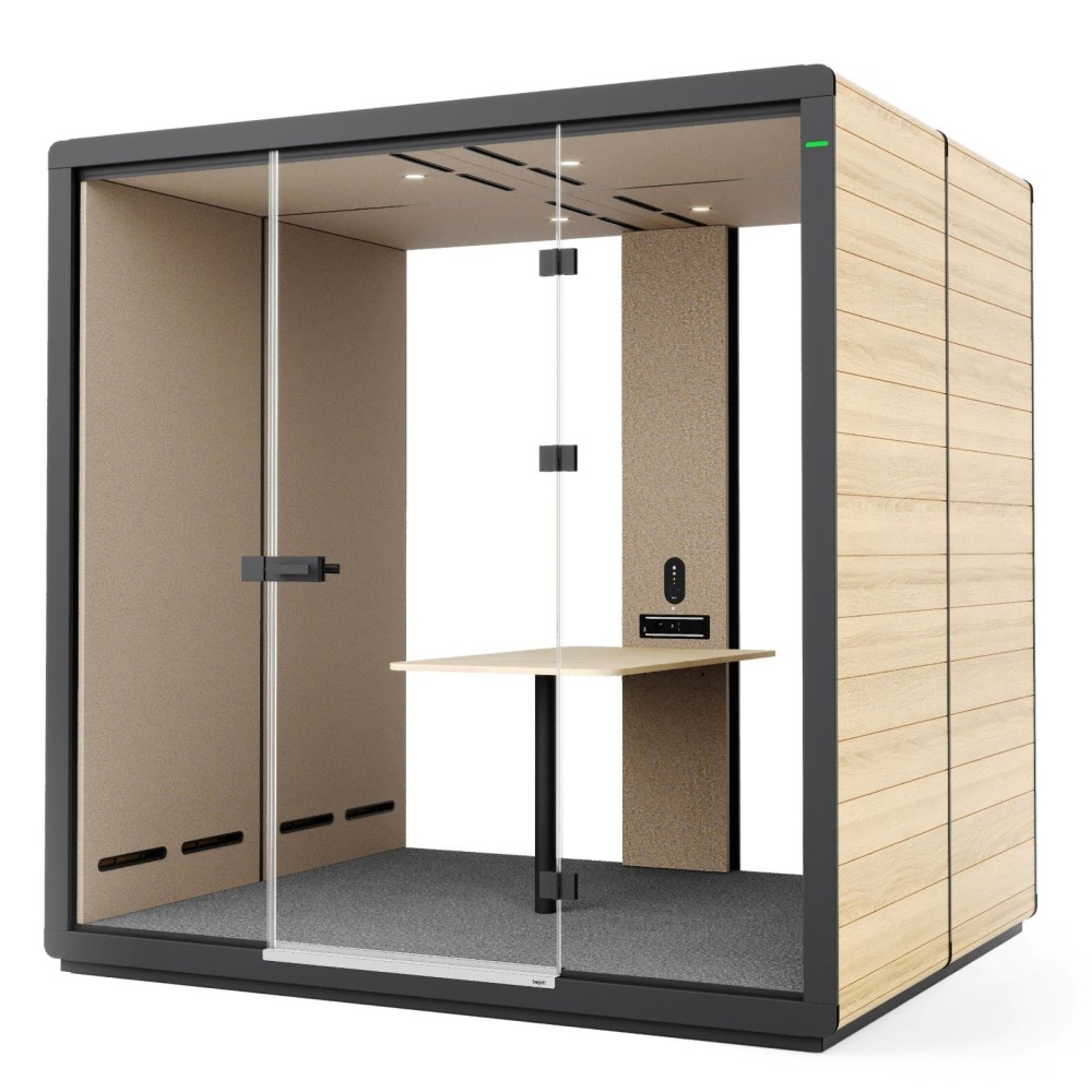 Avec ses panneaux extérieurs en chêne clair et ses parois intérieures tapissées, cette cabine conjugue esthétique contemporaine et ambiance chaleureuse. Sa finition bois permet une intégration harmonieuse dans tous les environnements : open space, coworking, hôtels d’entreprise ou salles de réunion partagées.