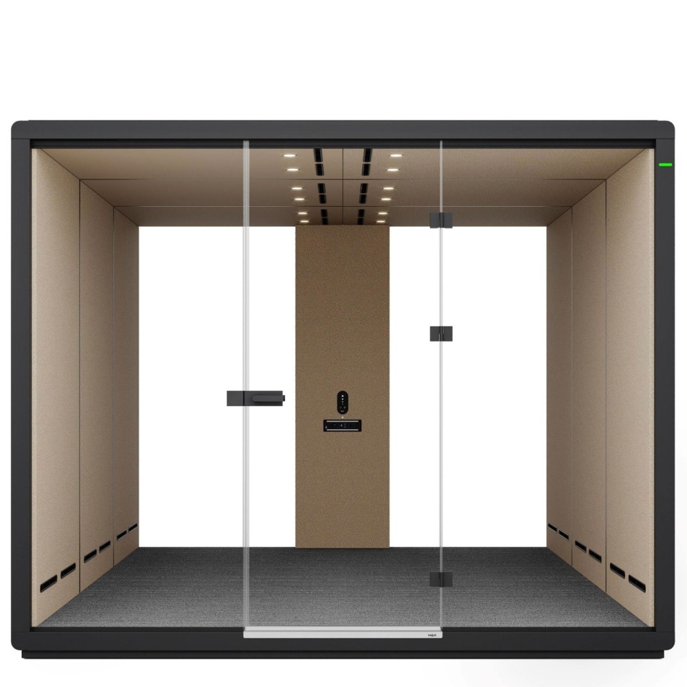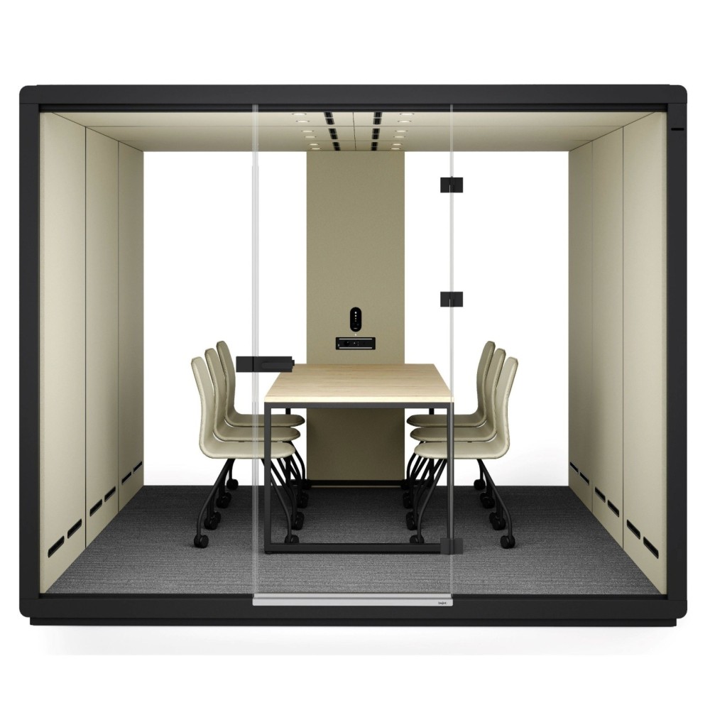 Cette cabine spacieuse peut accueillir confortablement jusqu’à six participants autour d’une grande table centrale en bois clair. Les parois tapissées absorbent les sons et améliorent la qualité des échanges. Le système d’éclairage LED automatique et la ventilation silencieuse sont activés par un détecteur de présence pour garantir un confort immédiat et constant. Après chaque utilisation, l’air est automatiquement renouvelé pour maintenir un environnement sain et agréable.