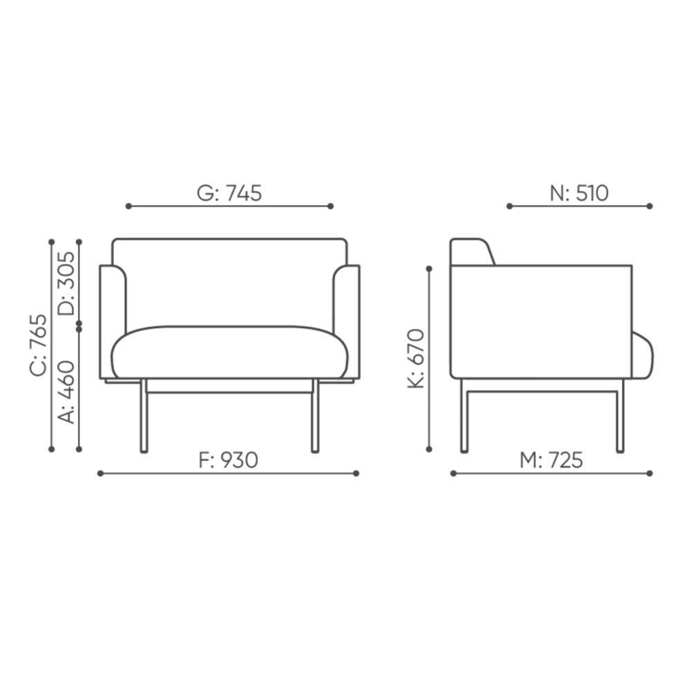 Ce fauteuil s’associe aux autres éléments de la collection Fora — poufs, fauteuils sans accoudoirs et tables assorties — pour composer des ensembles personnalisés. Sa modularité permet d’adapter les agencements selon les besoins, tout en conservant une unité visuelle élégante et contemporaine.
