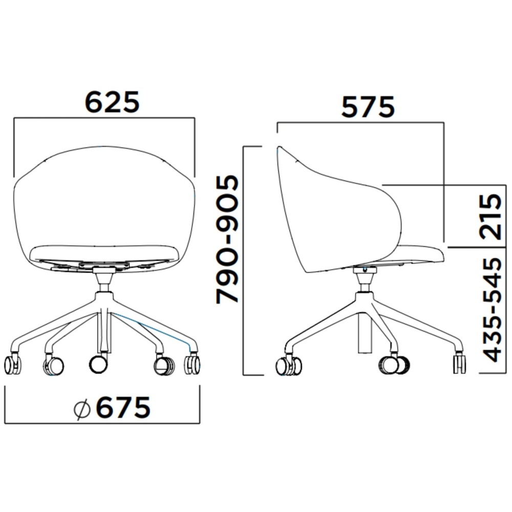 Équipée d’un piètement étoile à 5 branches avec roulettes robustes, la Volta assure des déplacements fluides et silencieux. Son diamètre de 675 mm garantit une grande stabilité, même en mouvement, tout en offrant une parfaite maniabilité dans les environnements dynamiques.
