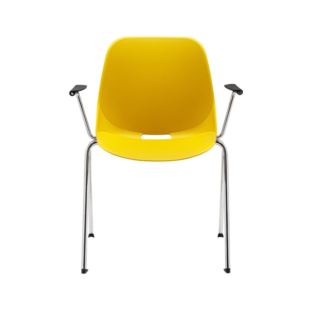 La chaise est disponible avec ou sans accoudoirs et peut être équipée d'une tablette écritoire amovible, idéale pour les salles de formation ou les séminaires. Sa structure en acier chromé garantit une grande stabilité, tout en offrant une légèreté visuelle qui s’intègre facilement dans tous types de décor.