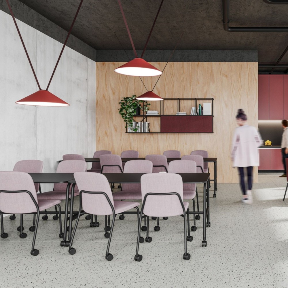 Équipé d’un piètement mobile à quatre roulettes, le siège Hens permet de réorganiser l’espace en quelques secondes. Déplacements fluides, transitions rapides entre travail individuel et travail en groupe : c’est le siège idéal pour les espaces modulaires et les usages intensifs.