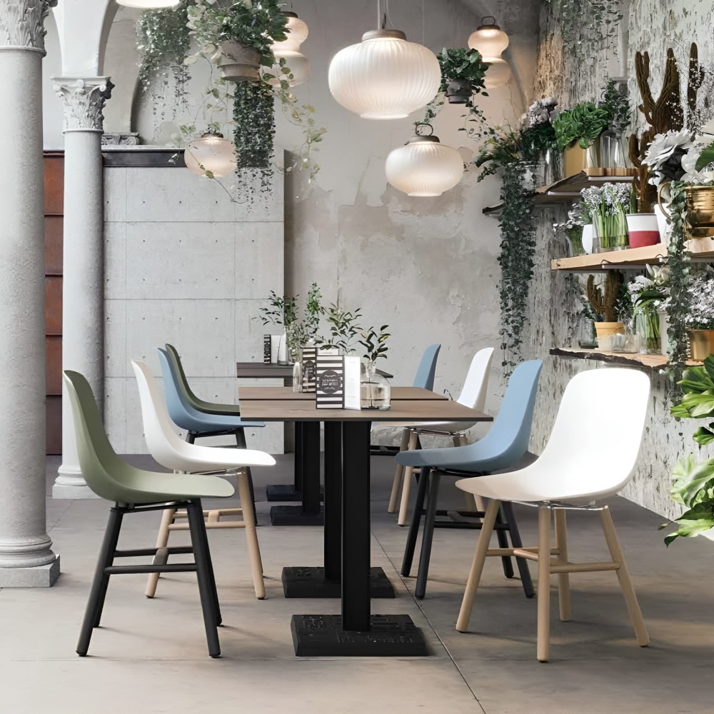 La coque est fabriquée en plastique moulé teinté, pour une finition uniforme et résistante. Disponible en plusieurs coloris doux ou vifs, elle s’intègre aussi bien dans un restaurant chic que dans une salle de réunion conviviale.