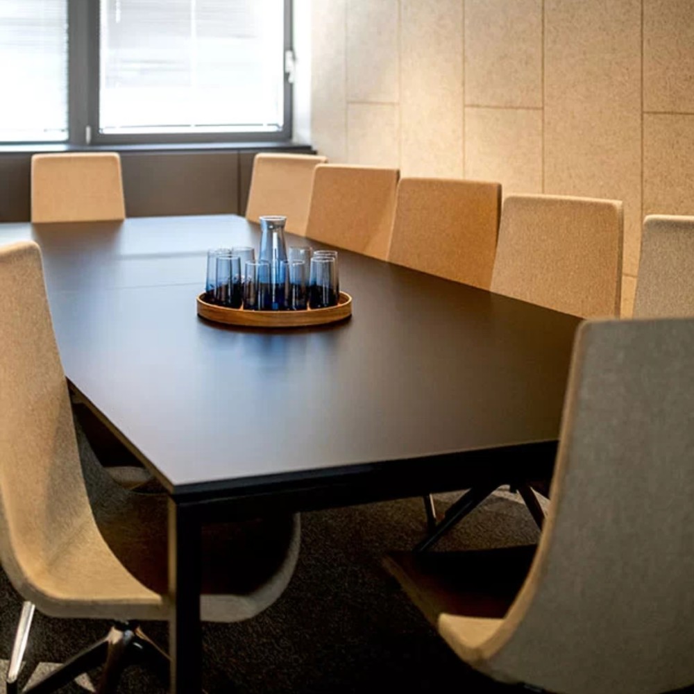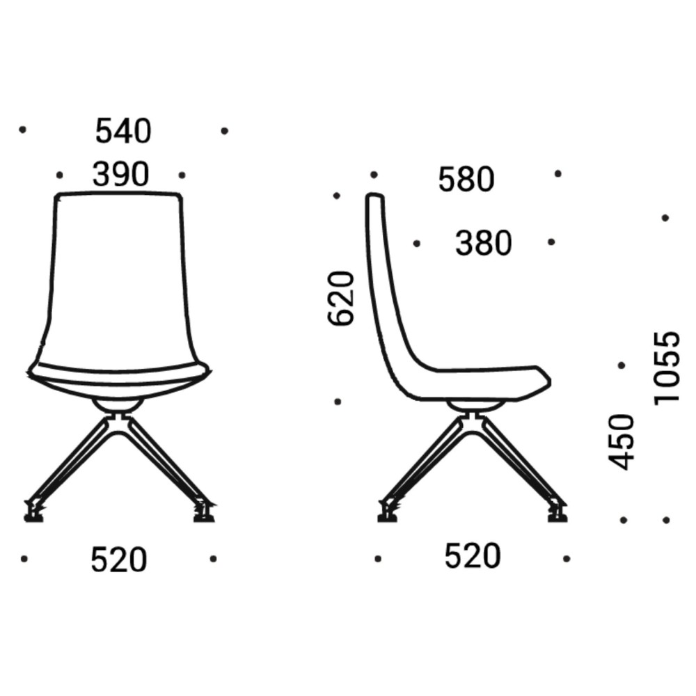 La chaise repose sur une base fixe à 4 pieds, tout en offrant une assise pivotante à 360°. Cette configuration favorise les échanges et les mouvements naturels pendant les réunions, sans l’encombrement d’une base à roulettes.