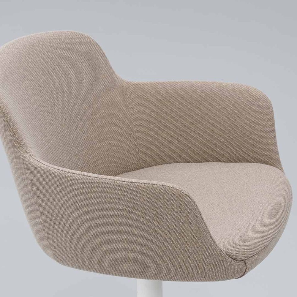 Son piètement en aluminium poli garantit stabilité et élégance, tandis que la structure interne en bois moulé assure solidité et confort. Disponible en tissu, cuir ou aspect cuir, la DANAE s’intègre parfaitement dans les espaces contemporains.