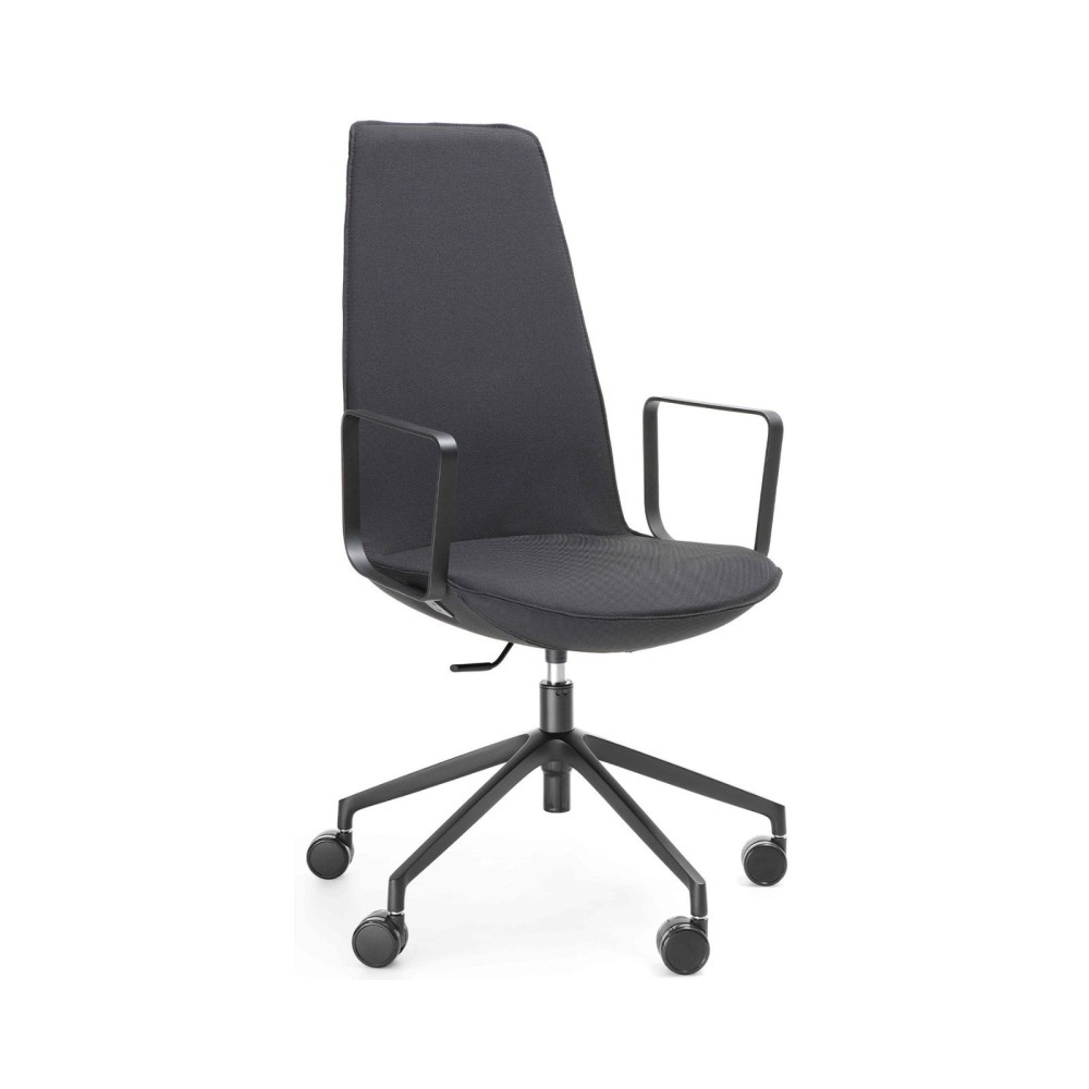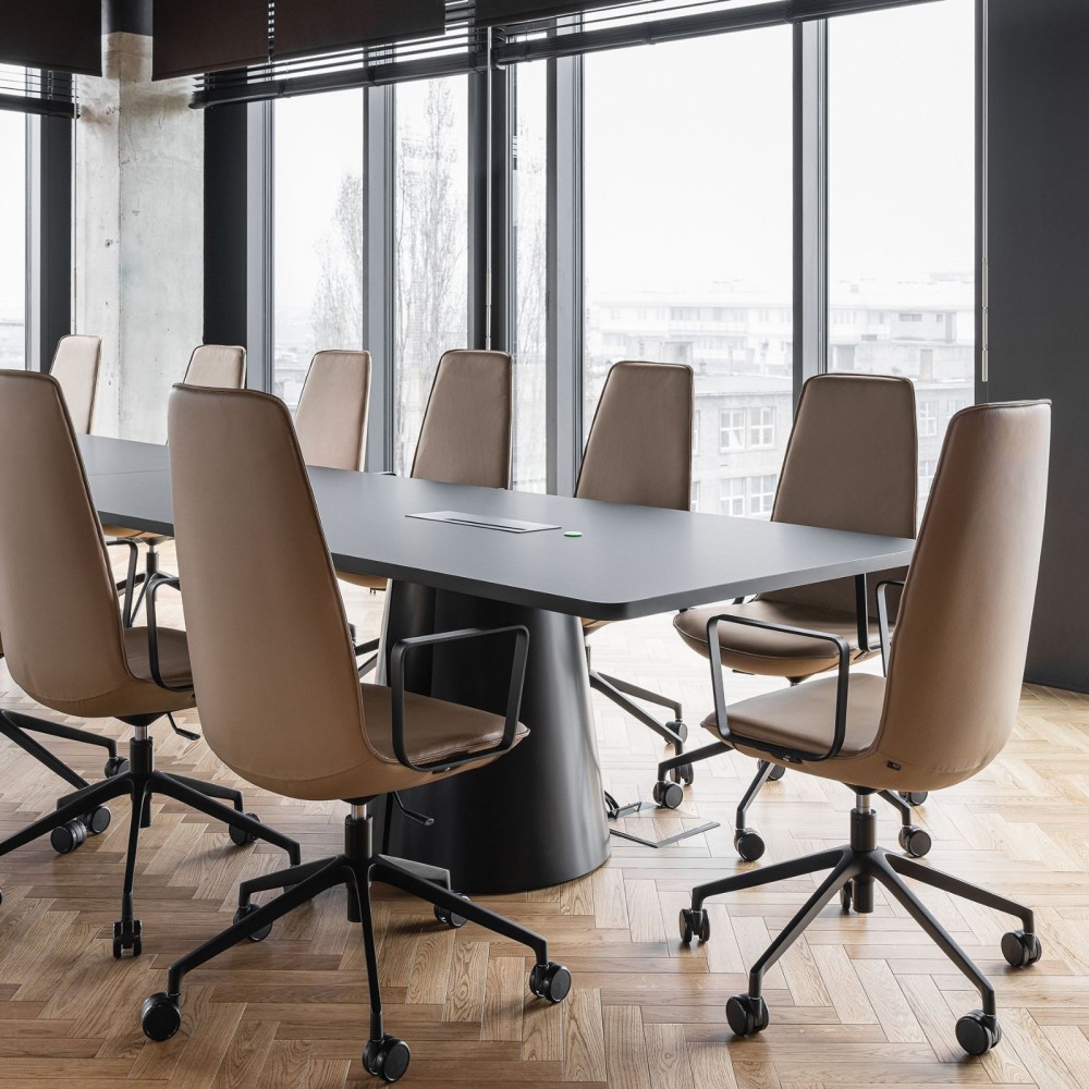 Ce fauteuil est équipé d’un piètement à roulettes pour une mobilité fluide, ainsi que d’un mécanisme de réglage en hauteur pour s’adapter à tous les utilisateurs. Le rembourrage généreux et le dossier haut garantissent un excellent maintien lombaire, même lors de longues réunions.