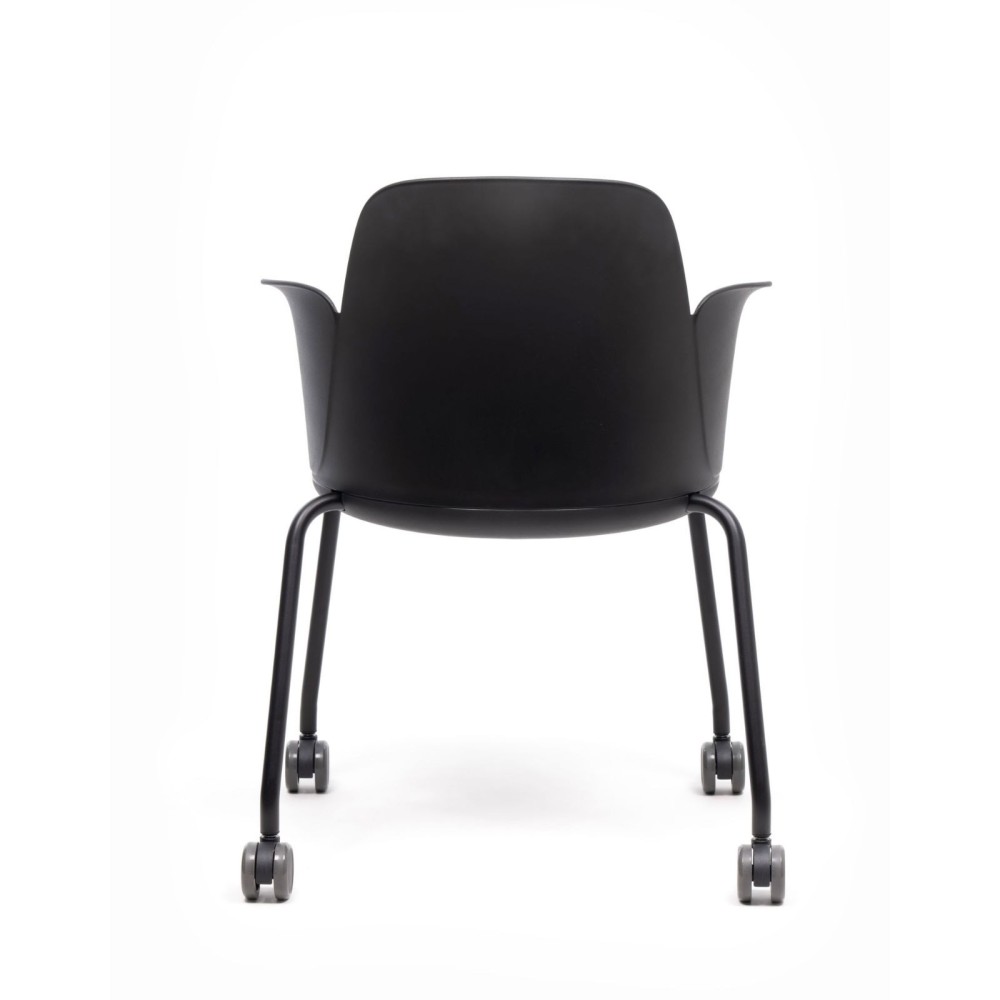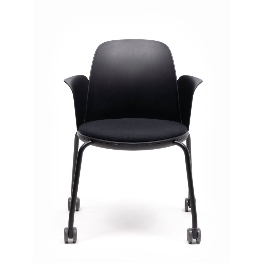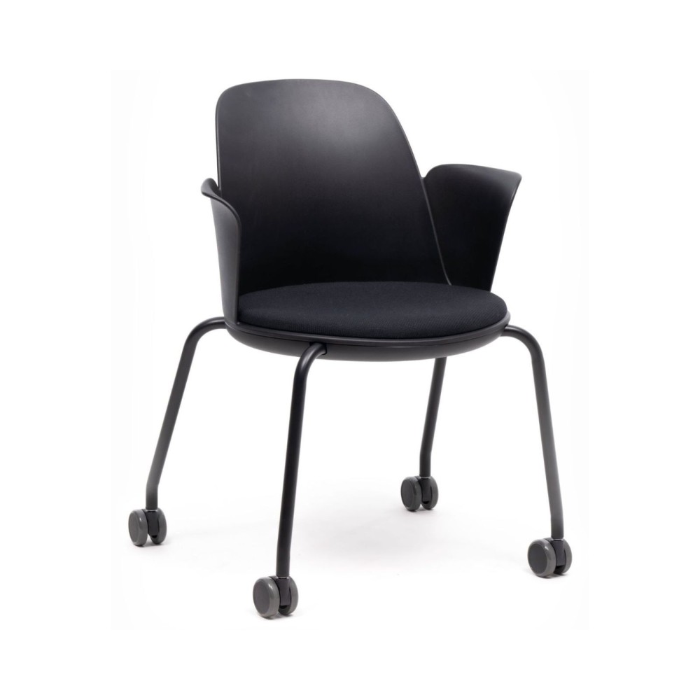 Ce modèle fait partie de la collection Haali ECO, conçue à partir de matériaux recyclés : 50 % post-industriels et 50 % post-consommation. La coque injectée en plastique renforcé de fibre de verre assure souplesse, résistance à l’usage intensif et confort durable. L’assise est ici rembourrée pour un confort optimal, même lors de longues réunions.
