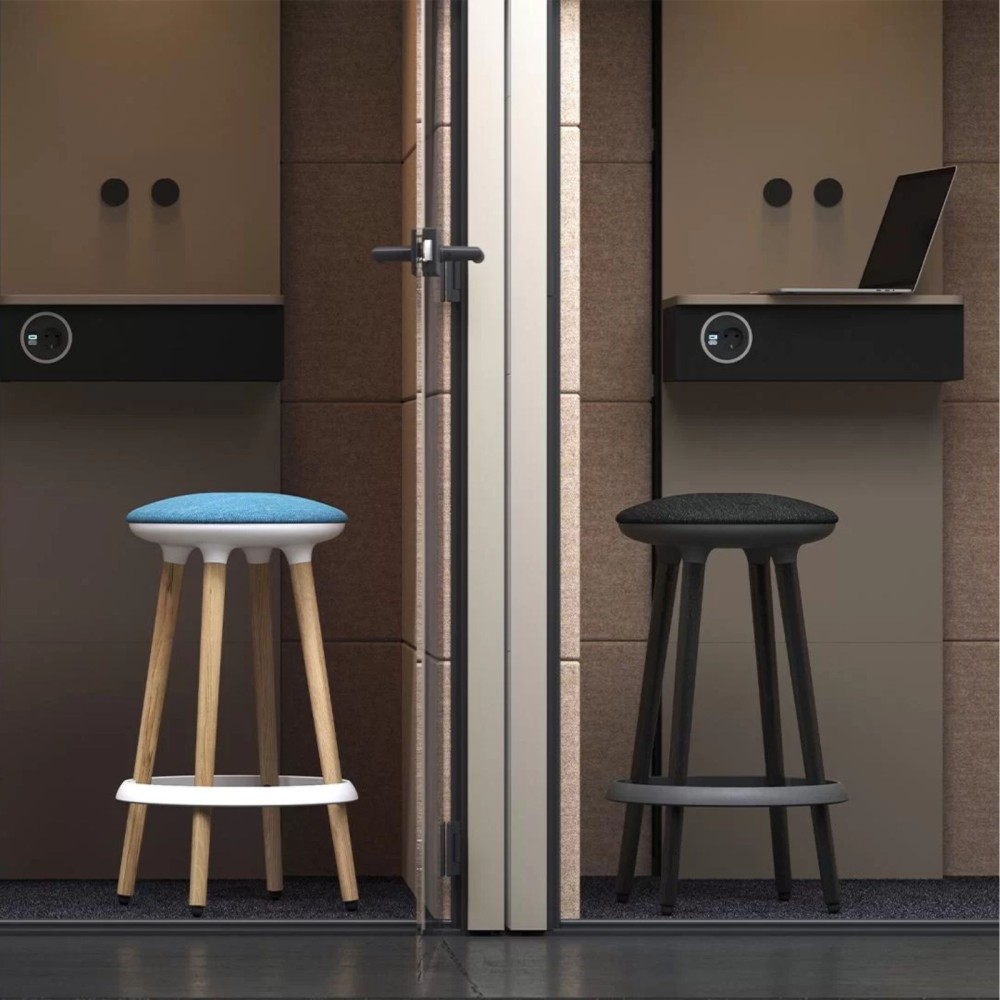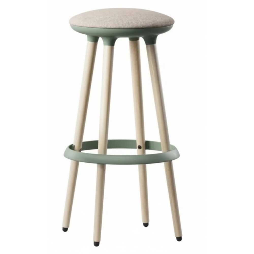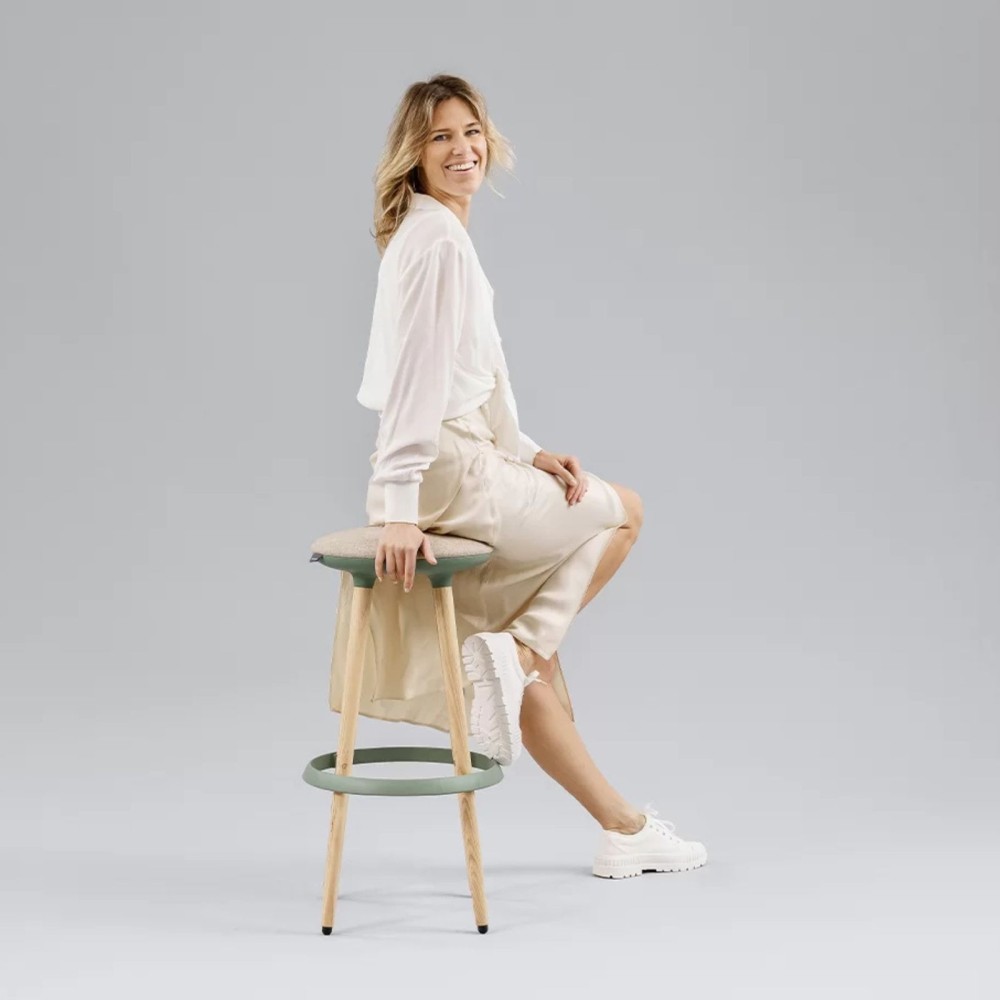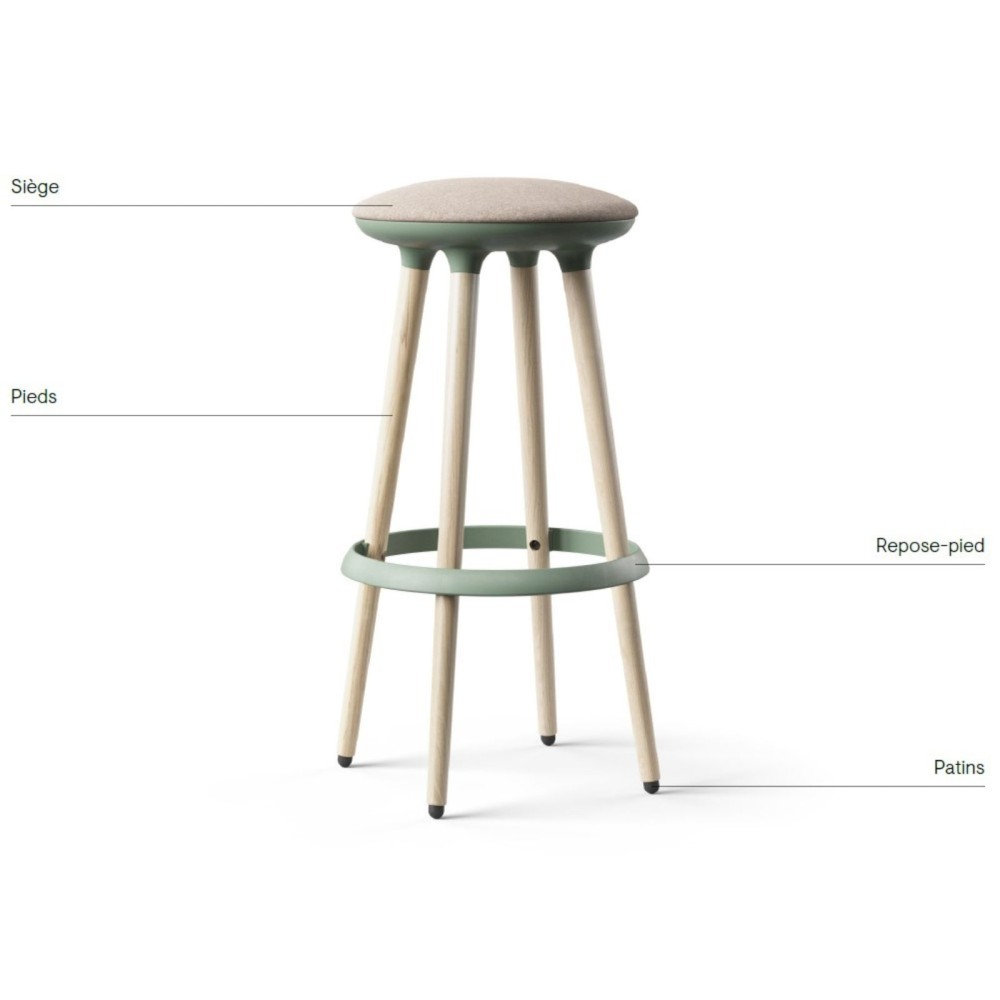 L’assise rembourrée, disponible en tissu ou simili cuir avec un large choix de coloris et textures, offre une assise agréable et ergonomique. Le repose-pieds circulaire en plastique recyclable complète le confort en soutenant la posture.