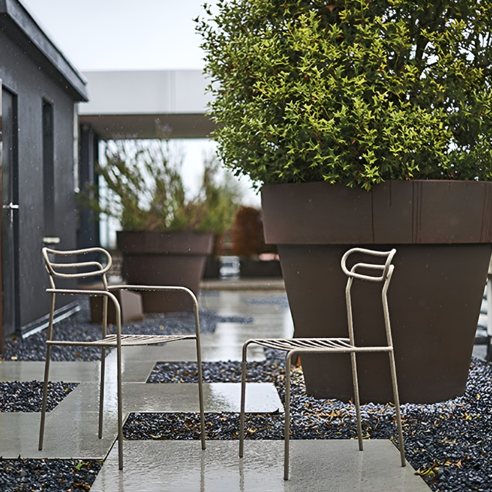 La chaise Uti est entièrement conçue en acier peint pour offrir une résistance maximale aux intempéries. Son dossier et ses accoudoirs métalliques apportent un soutien ferme et confortable, idéal pour les terrasses, jardins ou espaces extérieurs professionnels.