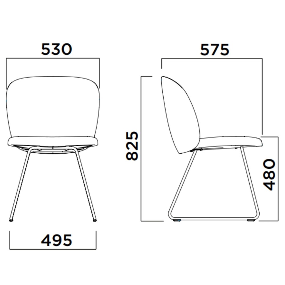 L’assise tapissée et le dossier arrondi enveloppent l’utilisateur pour un confort prolongé. Son piètement luge en métal thermolaqué assure robustesse et élégance, tout en offrant une grande stabilité.