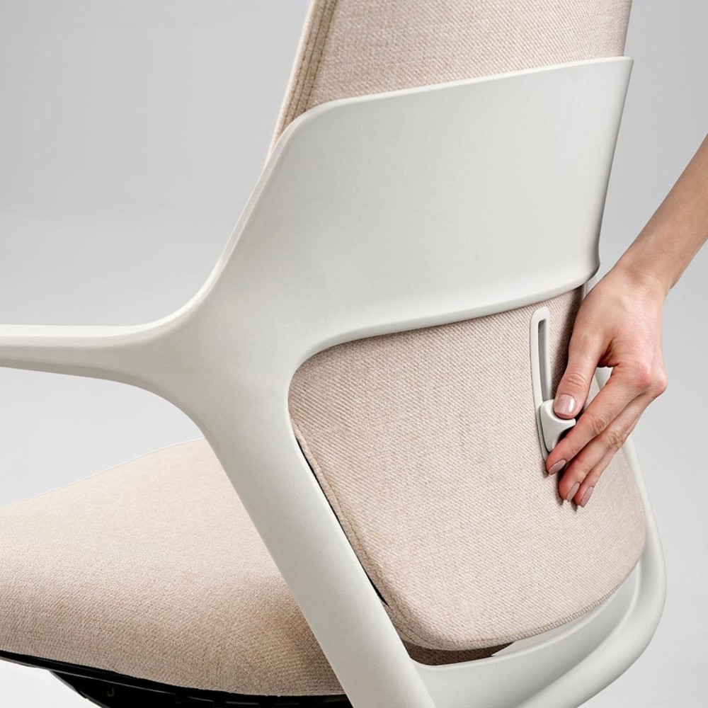 Le dossier de la chaise OFY version haut mesure environ 560 mm de hauteur. Il est idéal pour les personnes qui recherchent un maintien total du dos, jusqu’aux épaules et à la nuque. Sa forme légèrement courbée épouse la colonne vertébrale et accompagne les mouvements naturels du corps. Grâce à un mécanisme d’inclinaison synchrone, tu peux incliner le dossier selon ta posture, et le bloquer sur 5 positions. Le tout est géré par un levier discret, intégré dans le mécanisme pour une esthétique épurée.