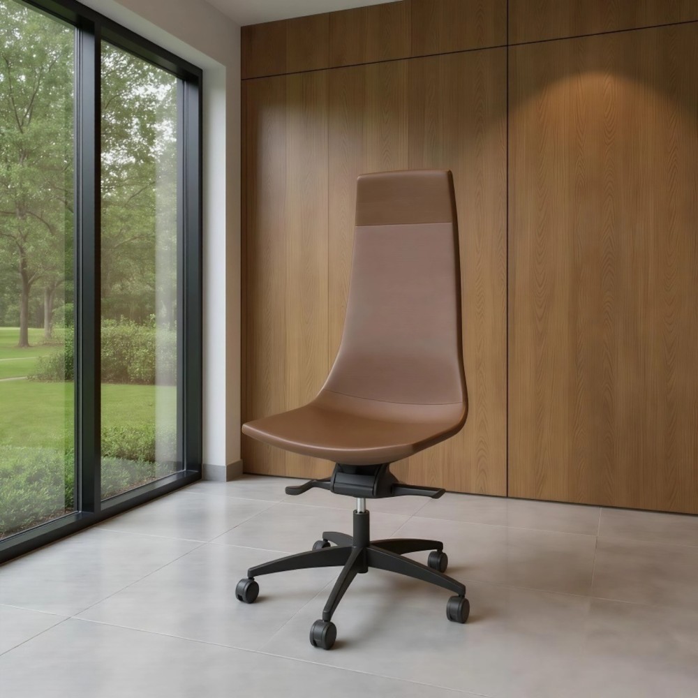 Le dossier monobloc sans couture apparente conserve une forme ergonomique pour maintenir une posture droite tout au long de la journée. Son design élancé inspire à la fois autorité et légèreté, parfait pour un bureau de direction ou une salle de réunion haut de gamme.