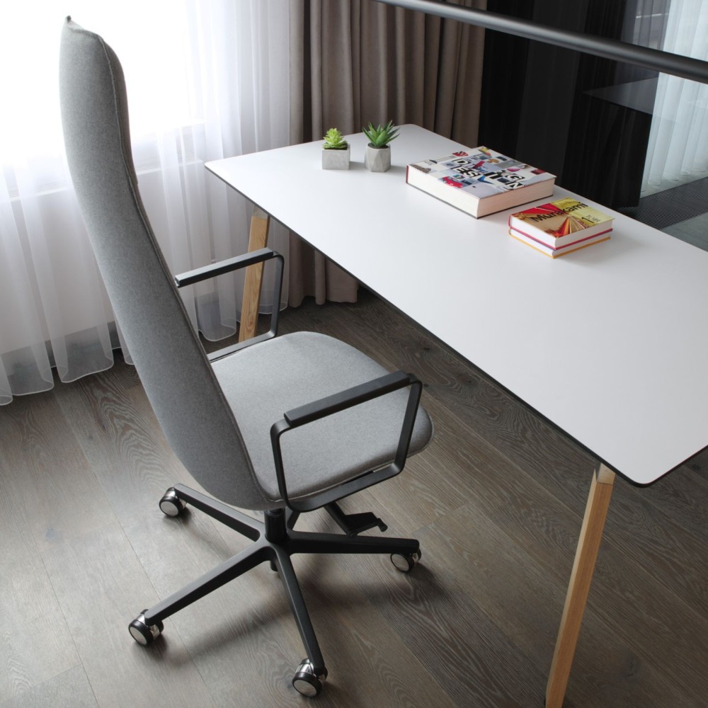 Grâce à son design épuré et son revêtement en tissu gris avec appui-tête en cuir, le Lumi LM 103 s’intègre parfaitement dans les intérieurs professionnels au style sobre et raffiné.