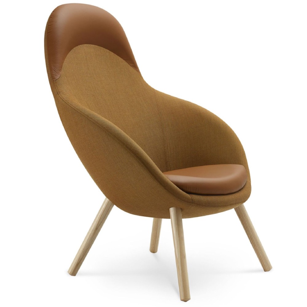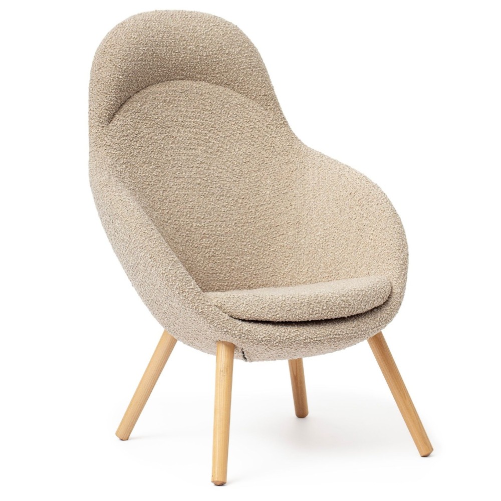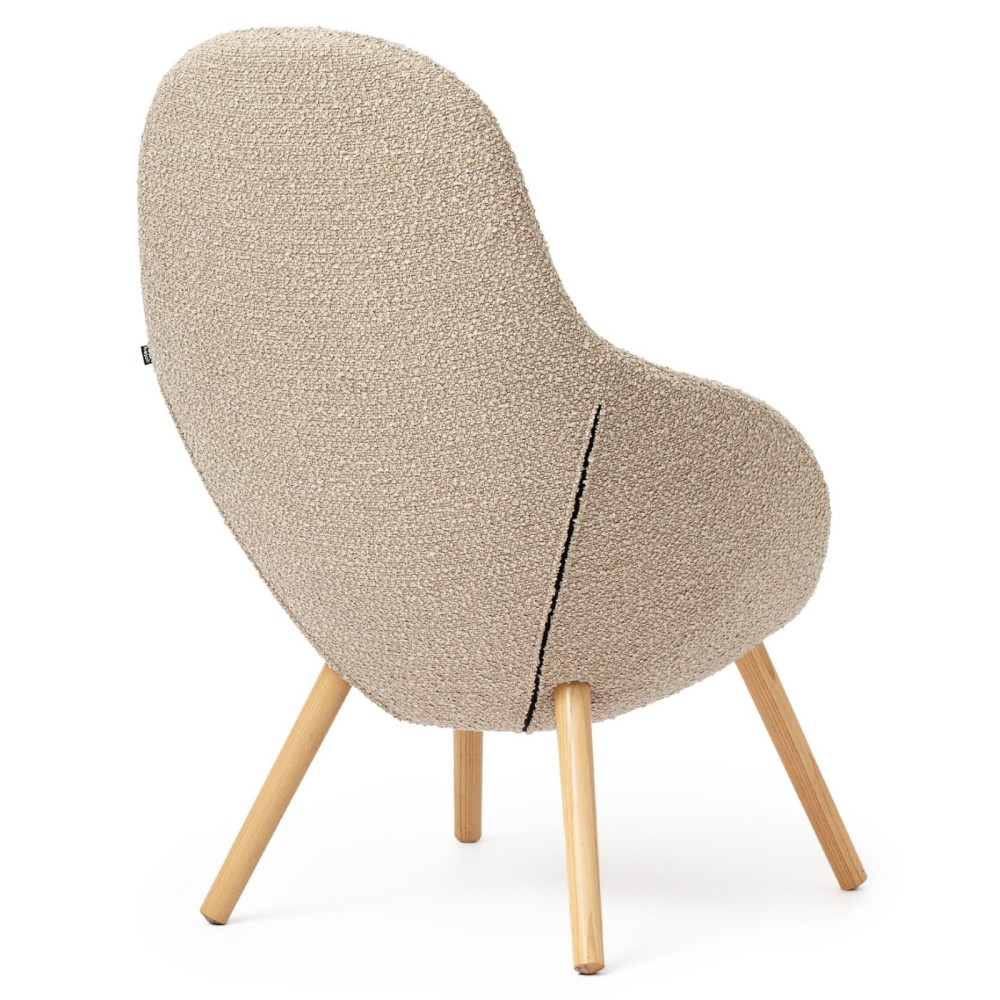 Son piètement en bois massif apporte stabilité et chaleur tout en renforçant son esthétique naturelle. La silhouette arrondie du fauteuil, soulignée par des coutures discrètes, lui permet de s’intégrer avec harmonie dans différents environnements contemporains.