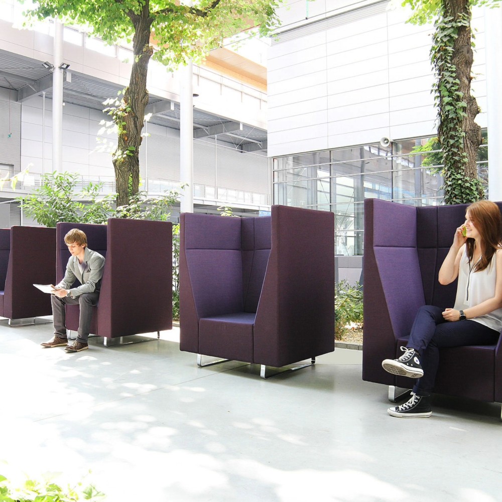Espace d’attente extérieur avec plusieurs fauteuils acoustiques Voo Voo violets. - Voo Voo