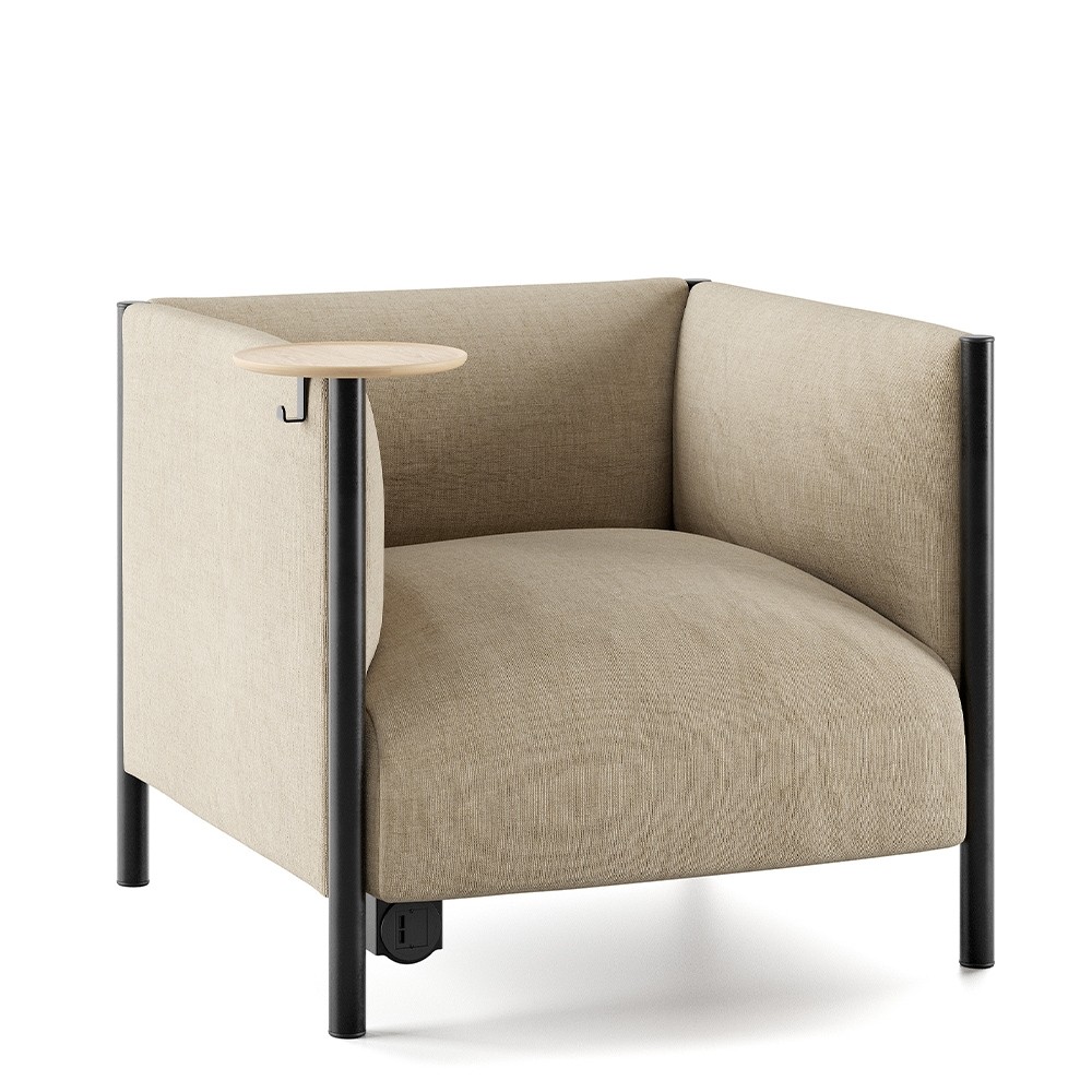 Fauteuil Waffle One beige avec tablette latérale en bois clair – accoudoirs hauts et assise confortable