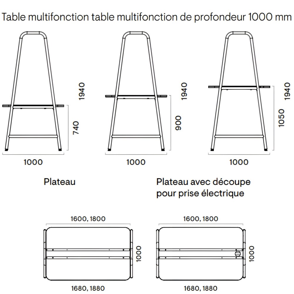 - Plateau HPL ou HPL Fenix (26 mm) – blanc, gris, noir