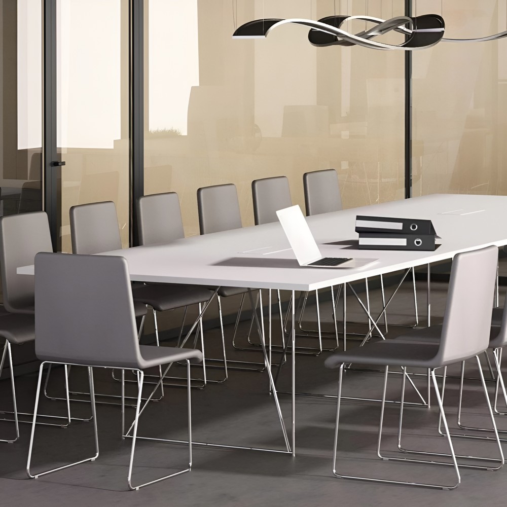 Avec son plateau bois plaqué de 25 mm et son piètement filaire noir graphique, la table AIR rectangulaire séduit par sa légèreté visuelle et sa silhouette contemporaine. Elle apporte style et fonctionnalité aux salles de réunion modernes.